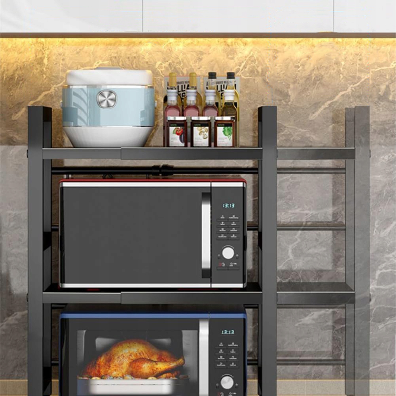 из углеродной стали и покрытый экологически чистой черной краской, устойчив к высоким температурам, эффективно предотвращая проблемы с ржавкой и обеспечивает длительное использование. Его прочность достаточна для поддержания микроволн и других кухонных посуды, таких как посуда, специи, консервы, специи, бутылки, тарелки, горшки, кастрюли и т. Д.