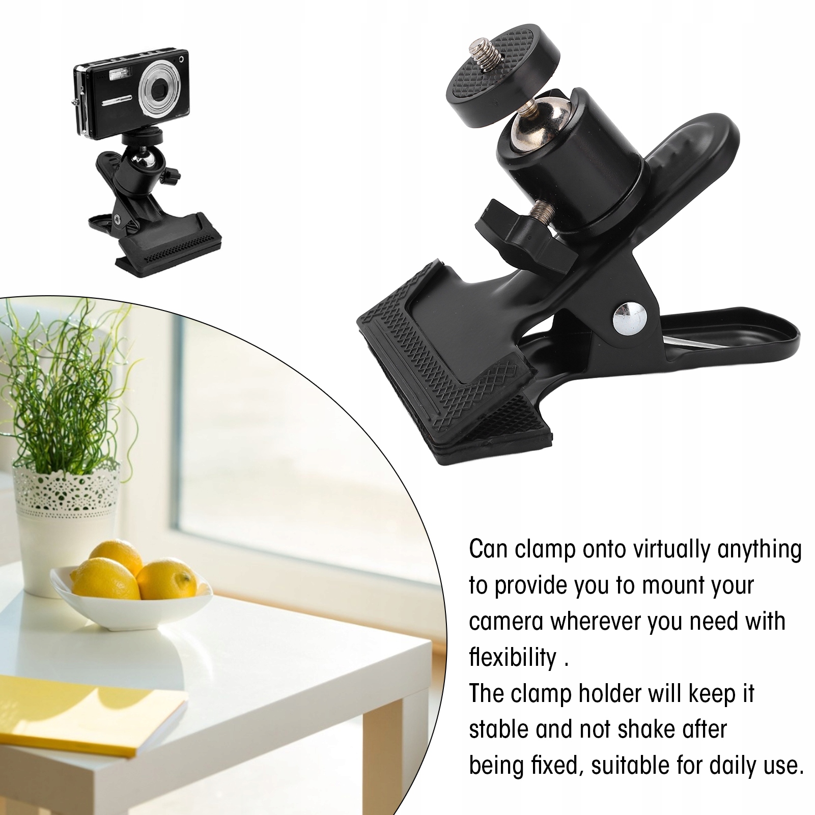 1. Держатель зажима сохранит его стабильным и не будет встряхивать после фиксации, подходящего для повседневного использования. Он принимает металлический материал, чтобы обеспечить длительный срок службы и качество, благодаря тому, что он устойчив к тяжелой работе и предотвращает деформацию. Часть клипа имеет пластиковый коврик, чтобы предотвратить повреждение клипа для штатива, обеспечивая удовлетворительный опыт использования. Вы можете затянуть практически все, чтобы гарантировать гибкость камеры в любом месте. Оснащен шаровой головкой на 360 °, которая может обеспечить достаточное удобство для создания собственного видео. Metal Studio Clip żabka зажим с головой