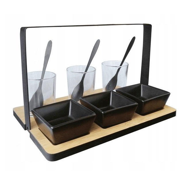 Набор мисок размещен на подставке с бамбуковым основанием. Благодаря подставке вы легко сможете переносить закуски, например, с кухни в гостиную.