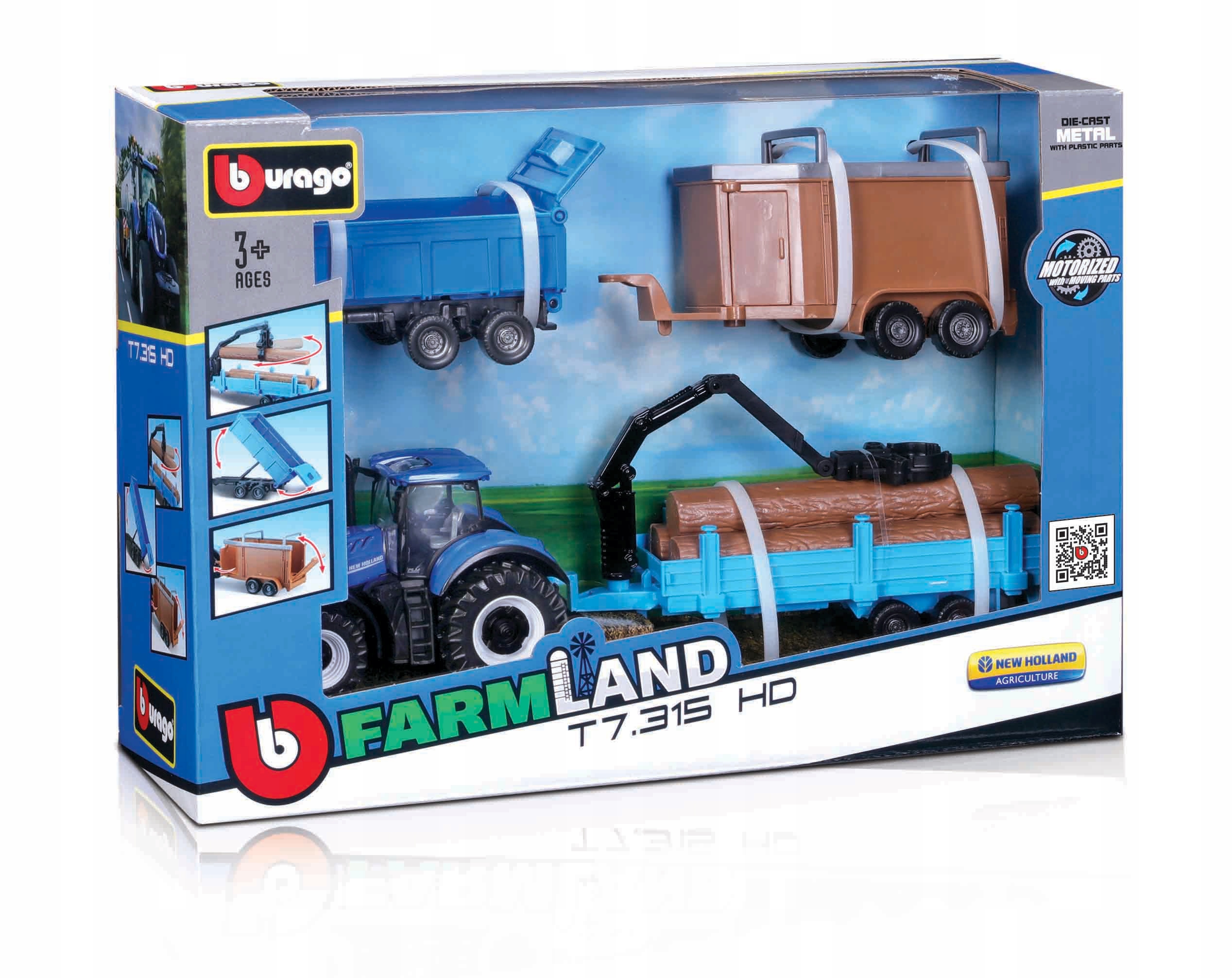 МЕТАЛЛИЧЕСКИЙ ТРАКТОР NEW HOLLAND + 3 ФЕРМЕРСКИХ ПРИЦЕПА