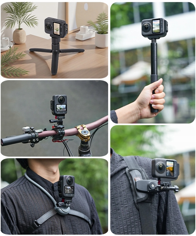 Держатель совместим с широким спектром аксессуаров Sunnylife и других, таких как зажимы для рюкзака, велосипеда, мотоцикла, крепления для головы, шеи, груди, штативы и удлинители. Благодаря этому вы сможете адаптировать его к любой ситуации и стилю записи.