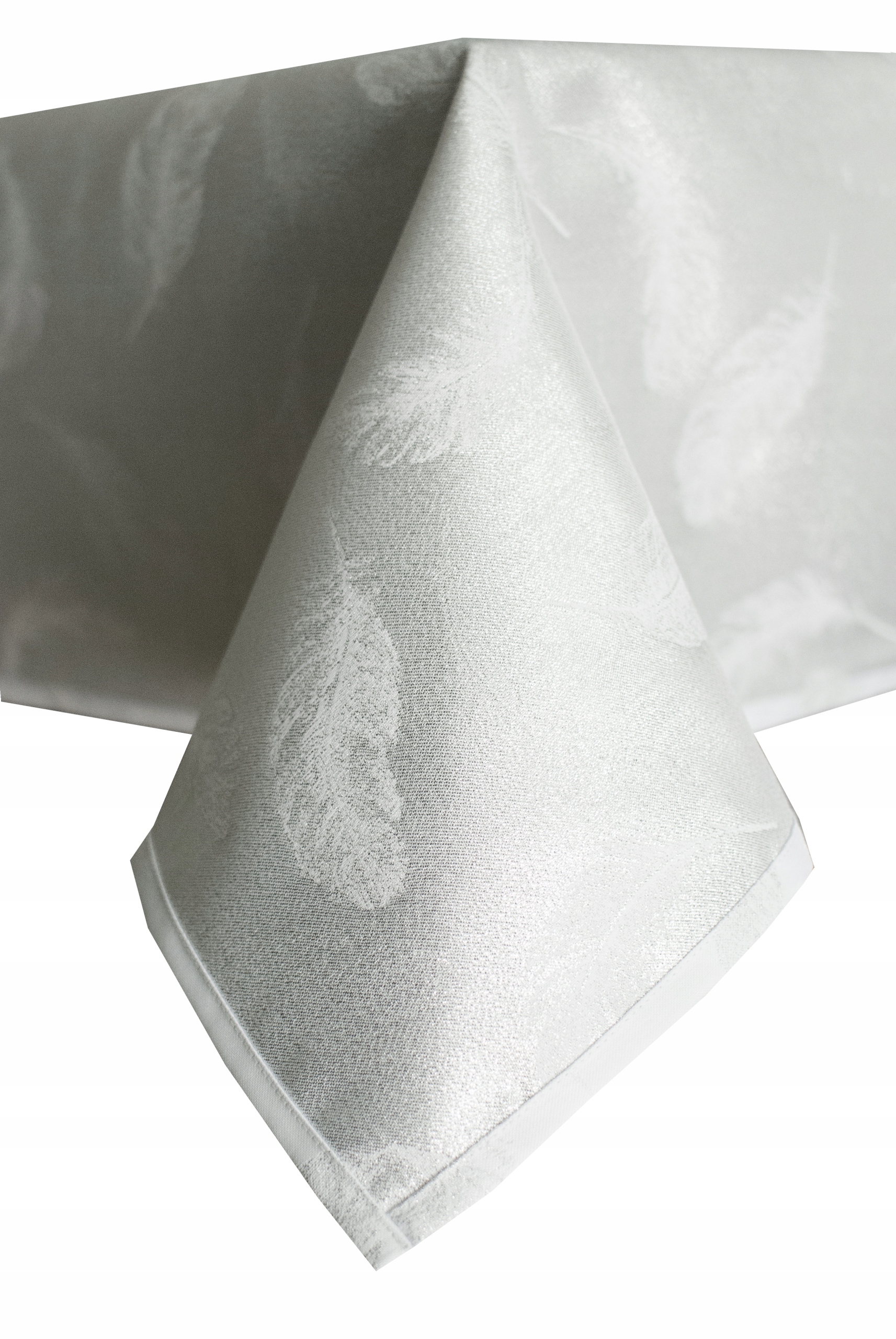 Красивая белая скатерть с блестящими серебристыми и белыми перьями. Перья добавляют легкости, а металлизированный узор подчеркнет неповторимый характер стола.