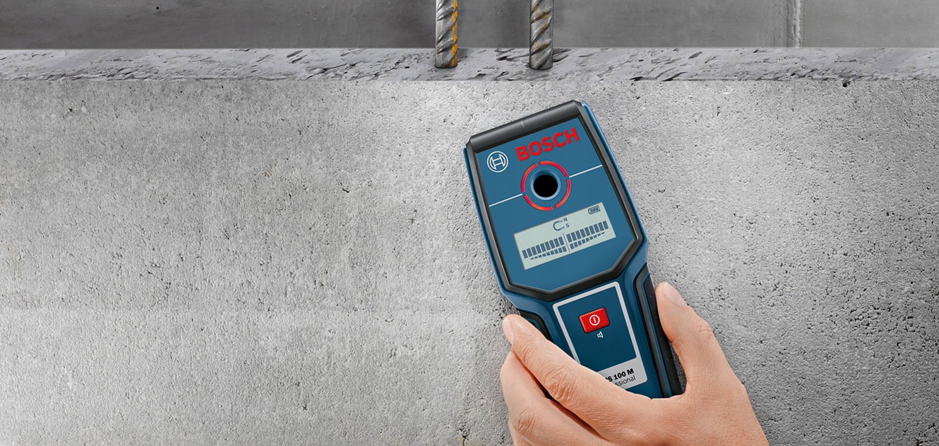 Bosch GMS 100 M — детектор для профессионалов, используемый для обнаружения черных и цветных металлов, а также проводов под напряжением в стенах.
