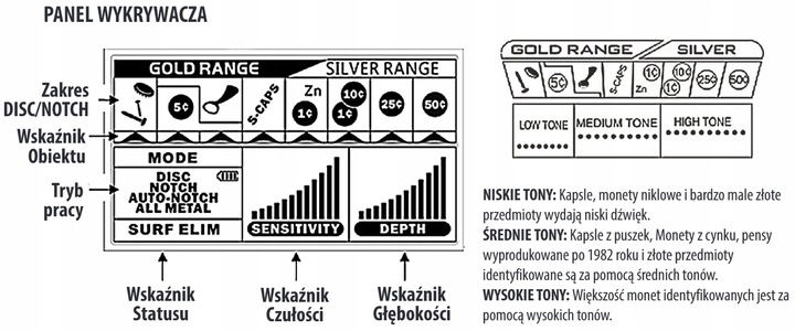ЦЕЛЬНОМЕТАЛЛИЧЕСКИЙ ДИСК, НОТЧ и АВТО-НОТЧ - это движущиеся режимы. В этих режимах детектор информирует о найденных объектах звуками 3-х разных тонов. Детектор работает в режиме автоматического баланса грунта. Чувствительность можно настроить в соответствии с вашими потребностями, но ручная балансировка грунта недоступна. Чтобы отклонить недорогие металлические предметы, используйте настройки ДИСК и НОТЧ. В режиме движения катушка должна постоянно двигаться, чтобы иметь возможность обнаруживать объекты.