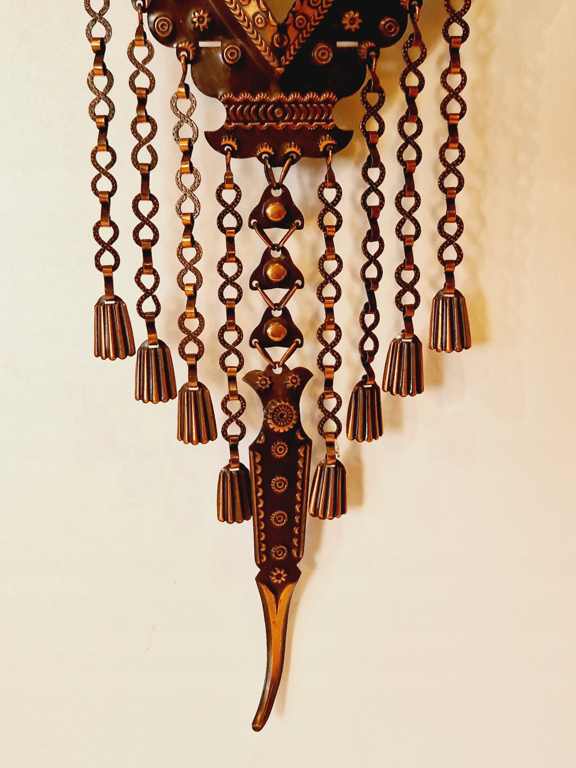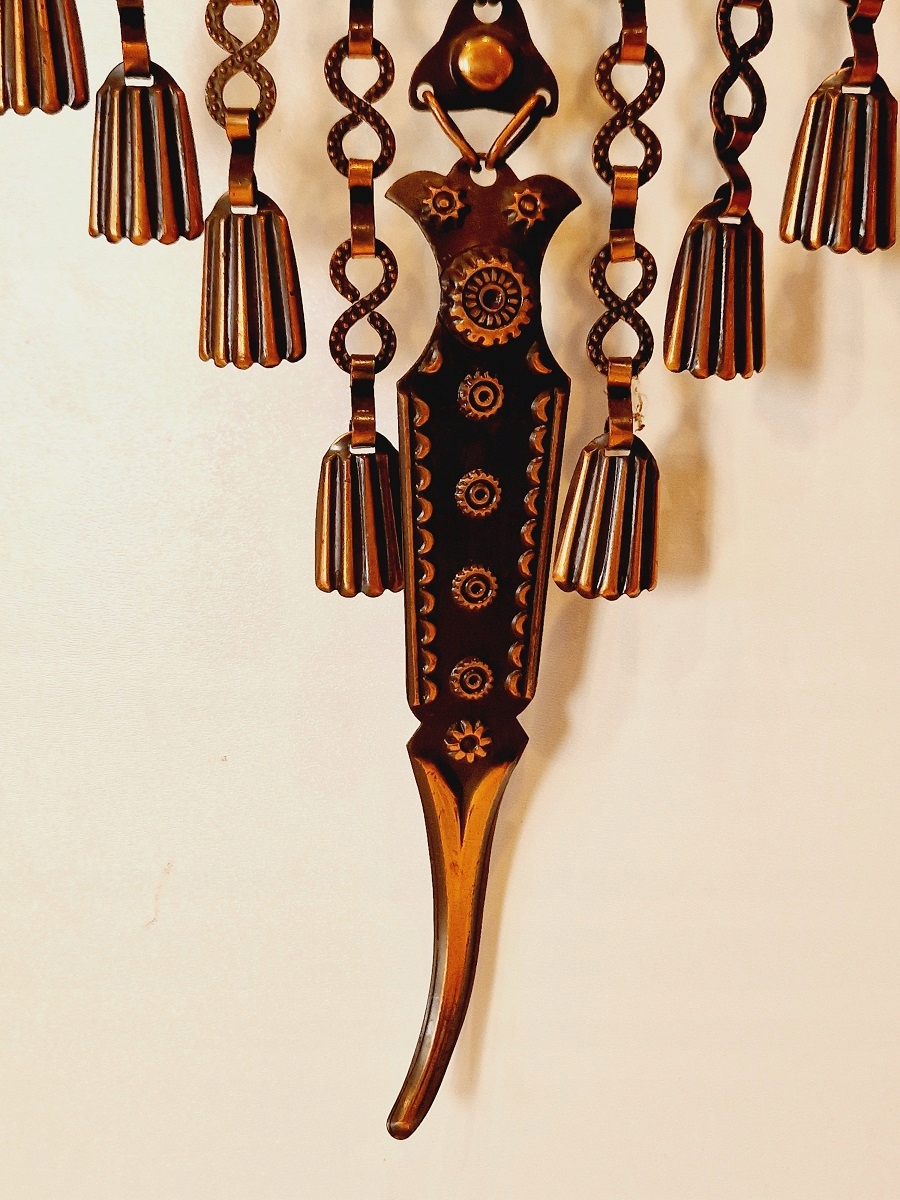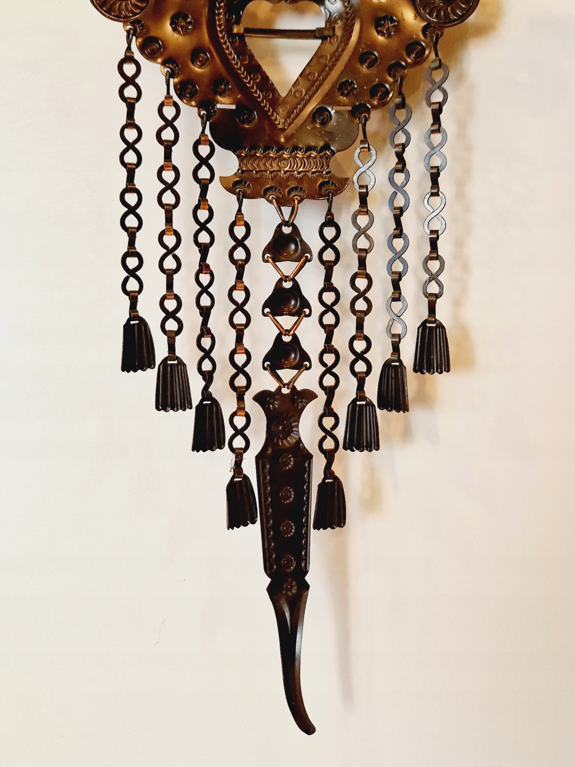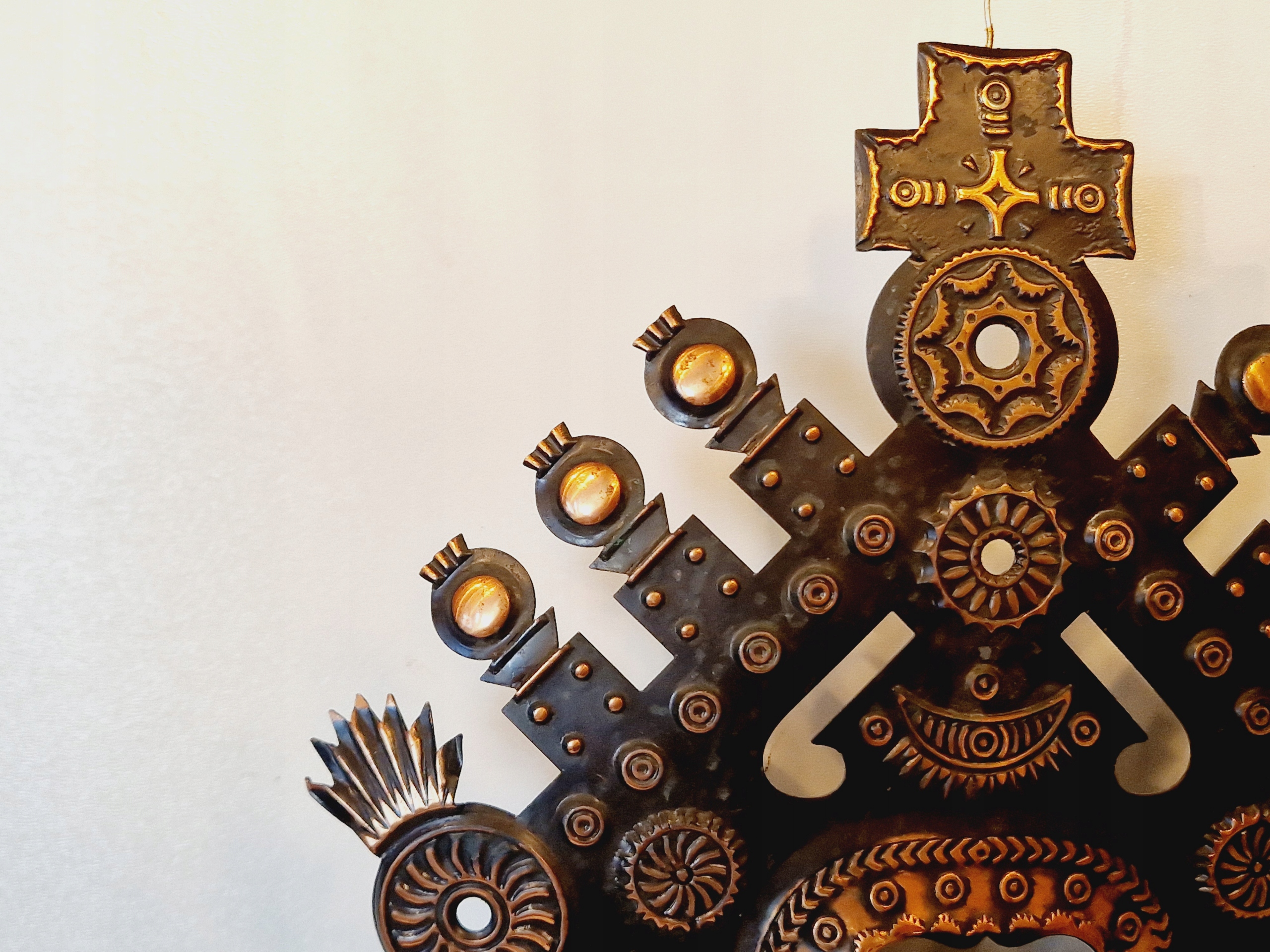 "Традиционные горские запонки, восходящие к готическим прототипам, украшены солнечными кругами, полумесяцами, звездами, а также зооморфными и геральдическими мотивами, особенно культовой головой хищной птицы, всегда видимой в профиль."< /п>