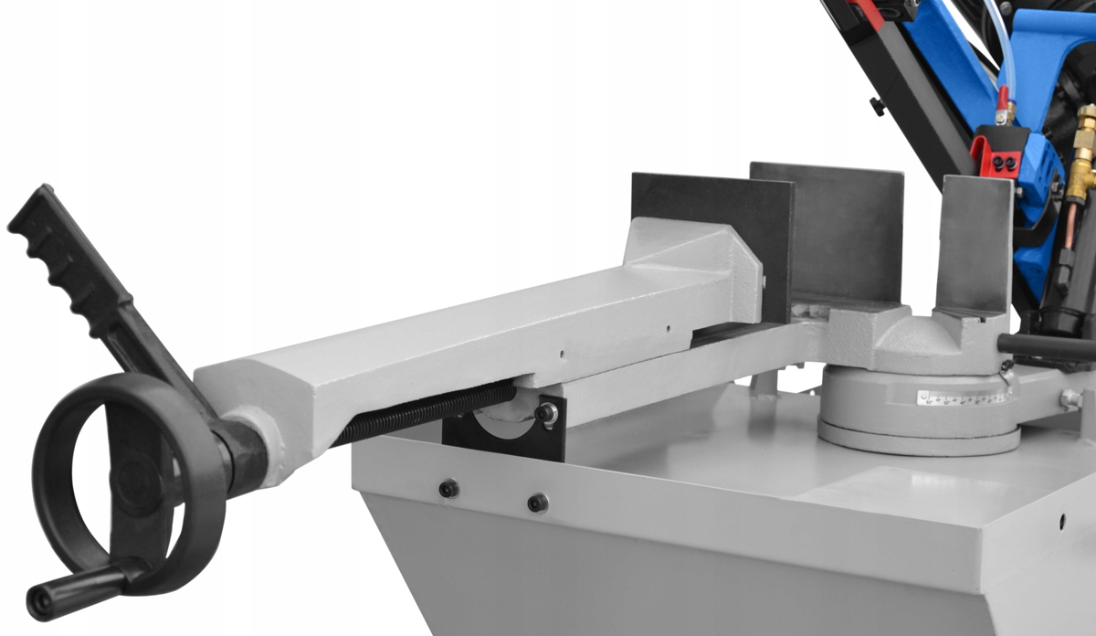 ☑️ Режущая лента натянута на двух чугунных колесах с помощью ручного натяжителя и направляется в регулируемых роликовых и скользящих твердосплавных направляющих.
