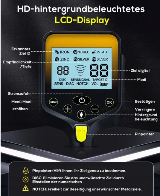 - 4 режима обнаружения】 Детектор металла имеет 4 режима обнаружения. Он будет хорошим помощником в поиске монет и сокровищ. Весь металлический режим: вы можете обнаружить любой металл. Дисковый режим: Осла нежелательные металлы, настройка значений. Notch Mode: нежелательные виды металла могут быть свободно заблокированы. Режим PP: найдите цель. Чувствительность и тон могут быть свободно регулируются