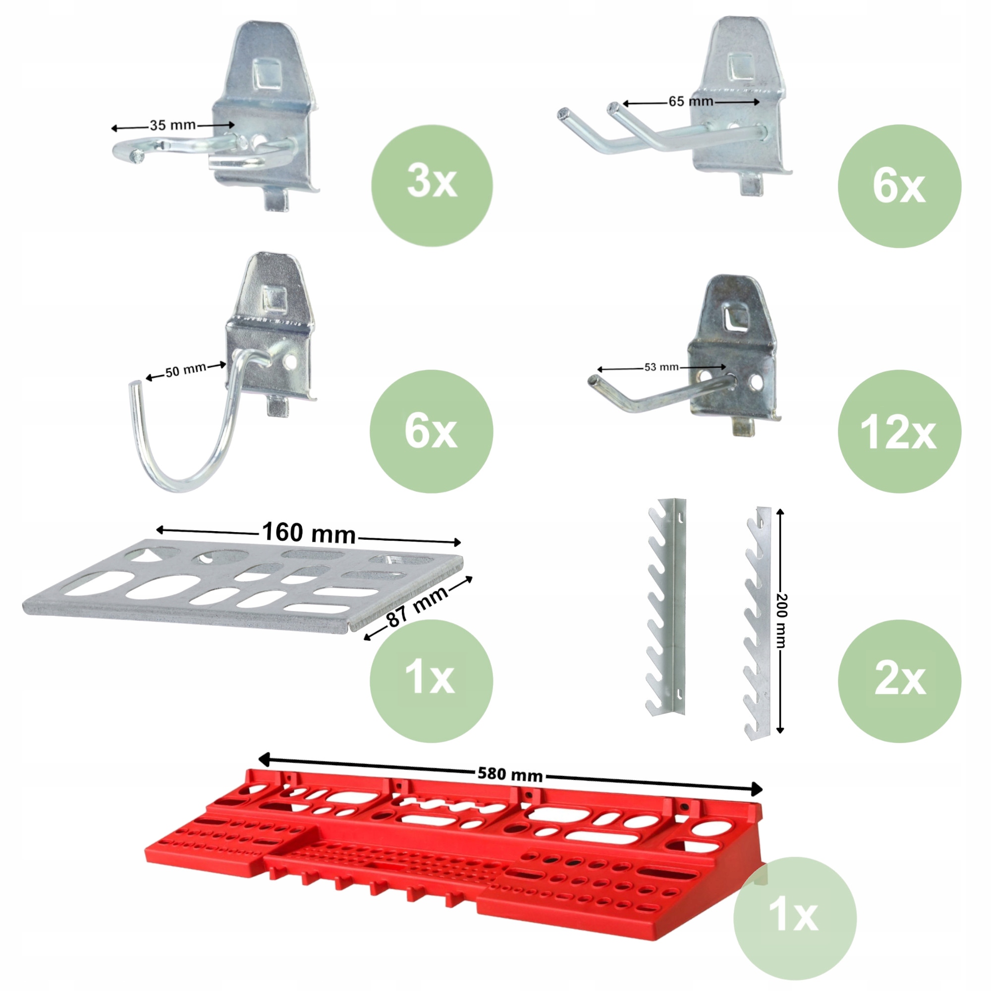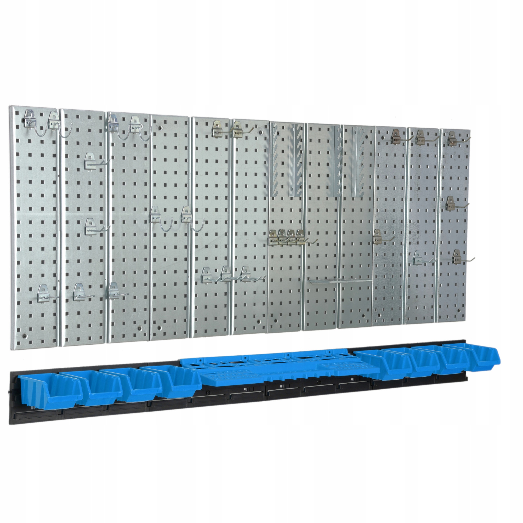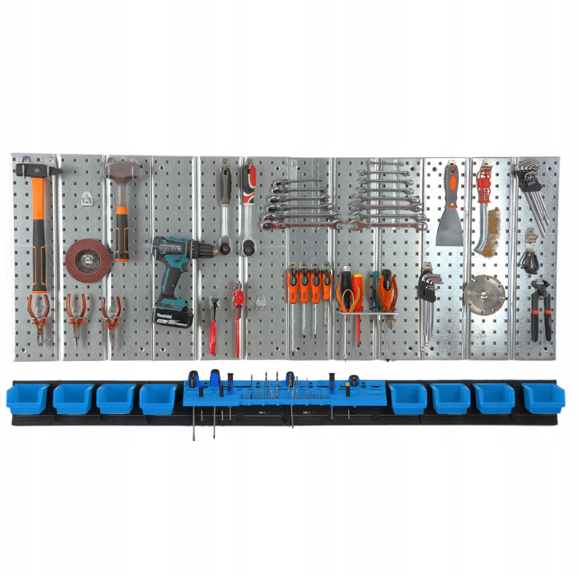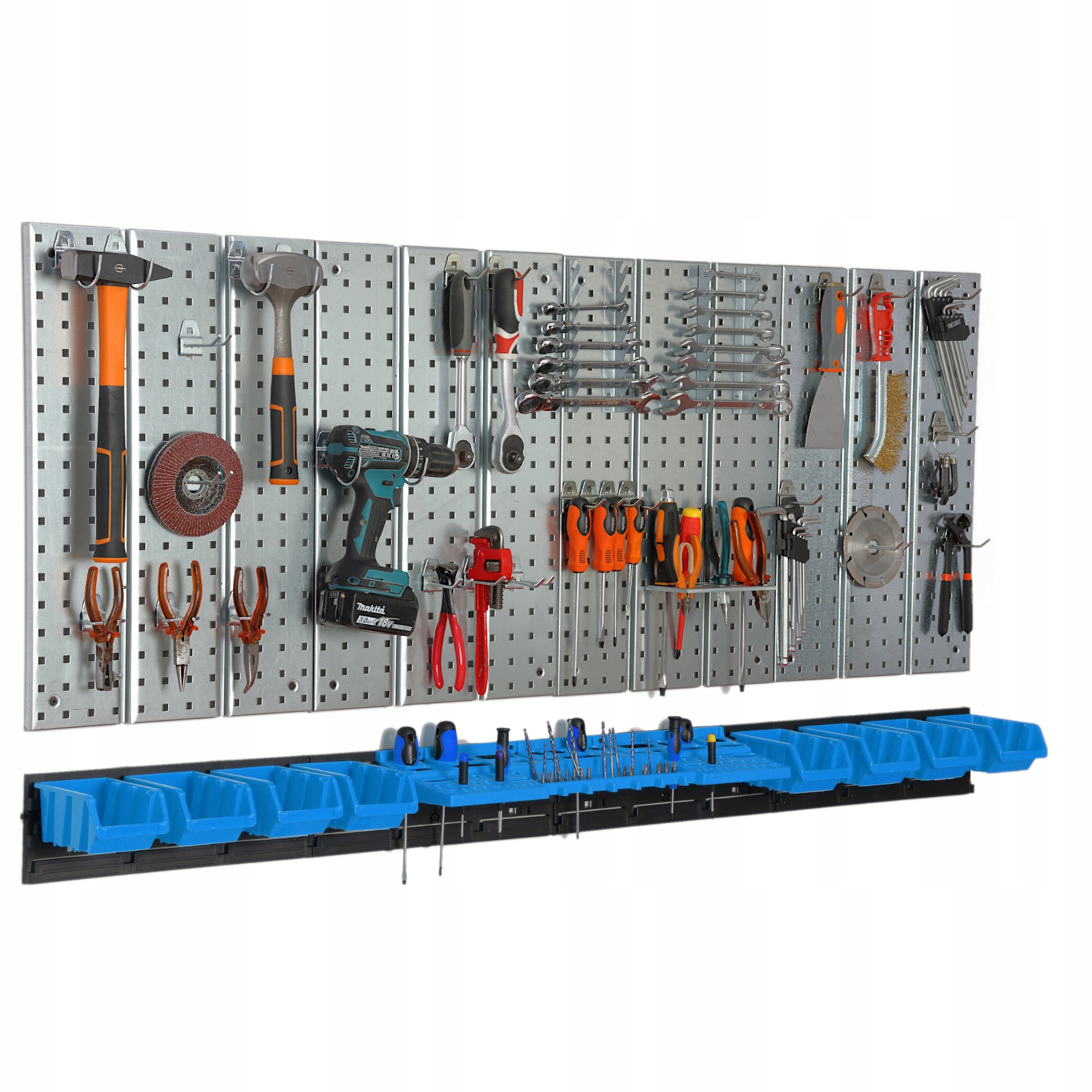 Представленный набор представляет собой комплектную металлическую перфорированную доску для инструментов со всеми видимыми на фотографиях держателями, полкой и лотками. (Без самих инструментов.)