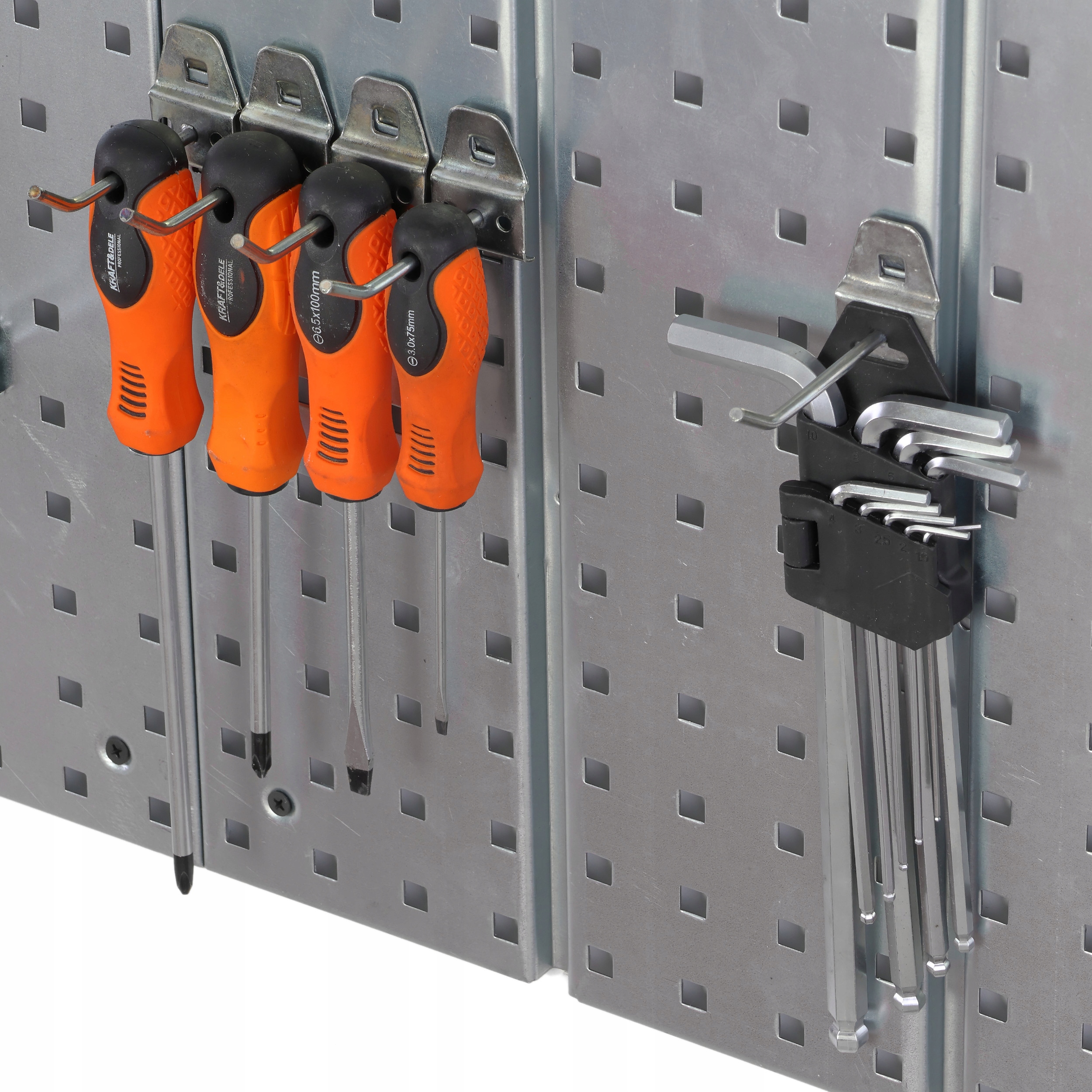 Металлические доски и держатели — отличное решение для поддержания порядка в гараже, подвале или мастерской. Высокое качество используемых материалов будет радовать вас долгие годы.