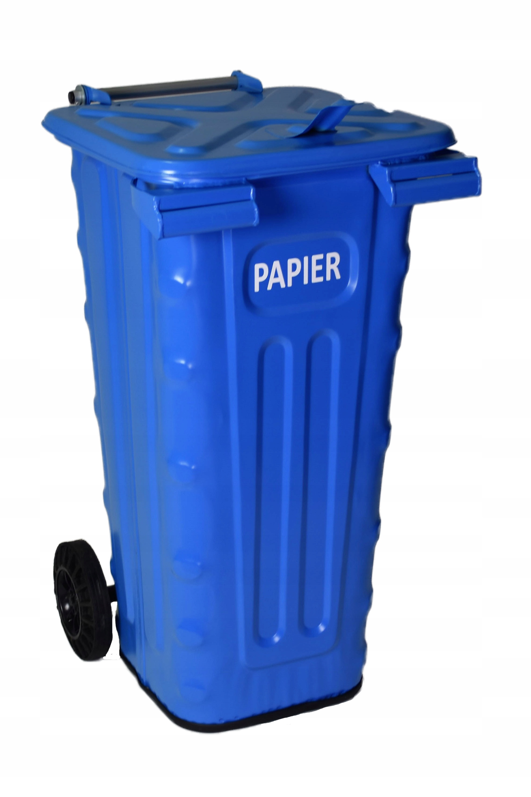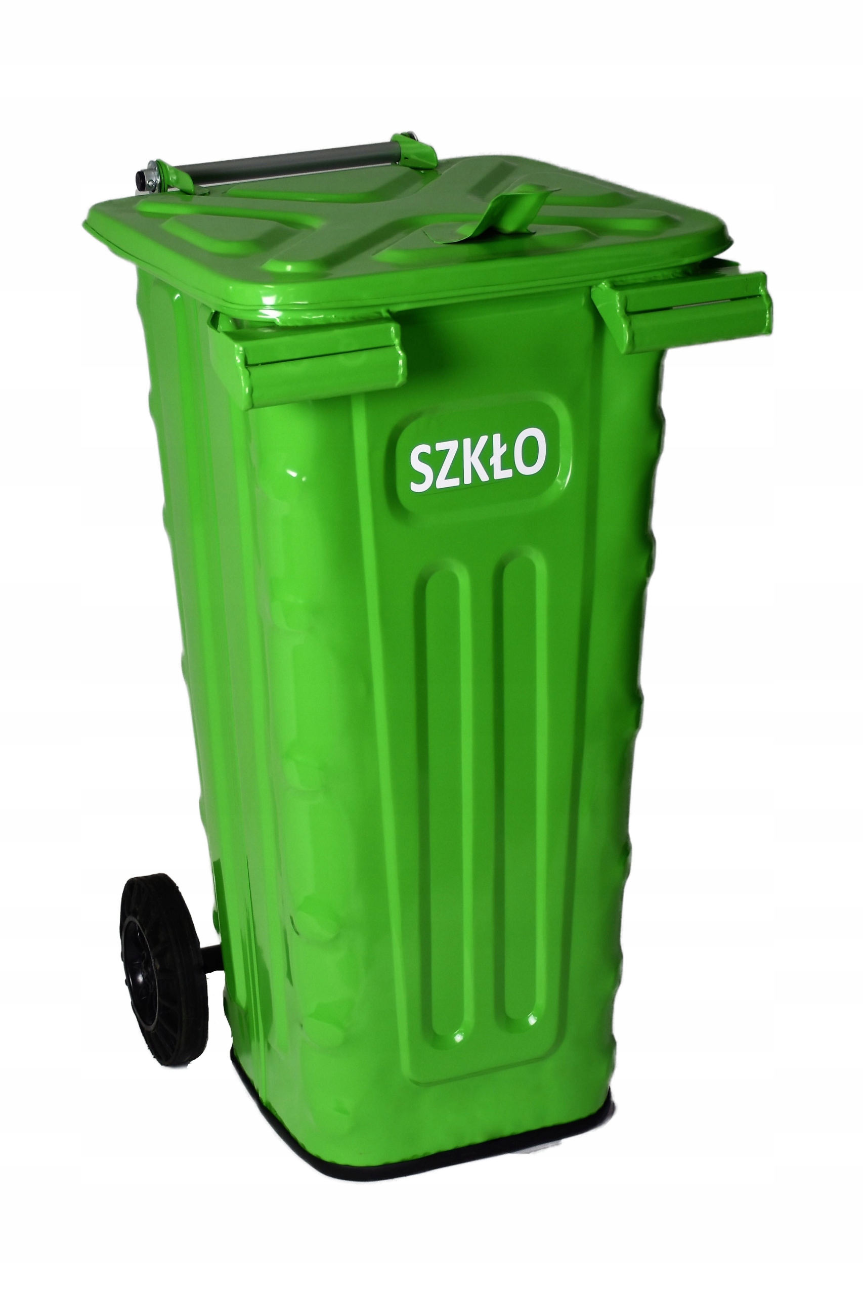 Контейнер, предназначенный для хранения и транспортировки различных видов отходов. Изготовлен из высококачественного оцинкованного листового металла, дополнительно усиленного многочисленными тиснениями, обеспечивающими высокую жесткость и эстетику контейнера. Компоненты конструкции соединяются сваркой и сваркой. Весь контейнер защищен от коррозии порошковым покрытием в соответствии с цветами селективного сбора мусора или в соответствии с индивидуальными потребностями, например, архитектурой или стилем (лофт). Крышка контейнера имеет усиливающее тиснение, шарнирно закреплена и оснащена ручками для открывания и транспортировки. Дно контейнера установлено на высоте 20 мм от земли, соединение днища с корпусом отделано приклеенной резиной, которая изолирует контейнер от земли и обеспечивает бесшумную работу и эстетику. Контейнер в стандартной комплектации оснащен двумя колесами, что облегчает его перемещение.