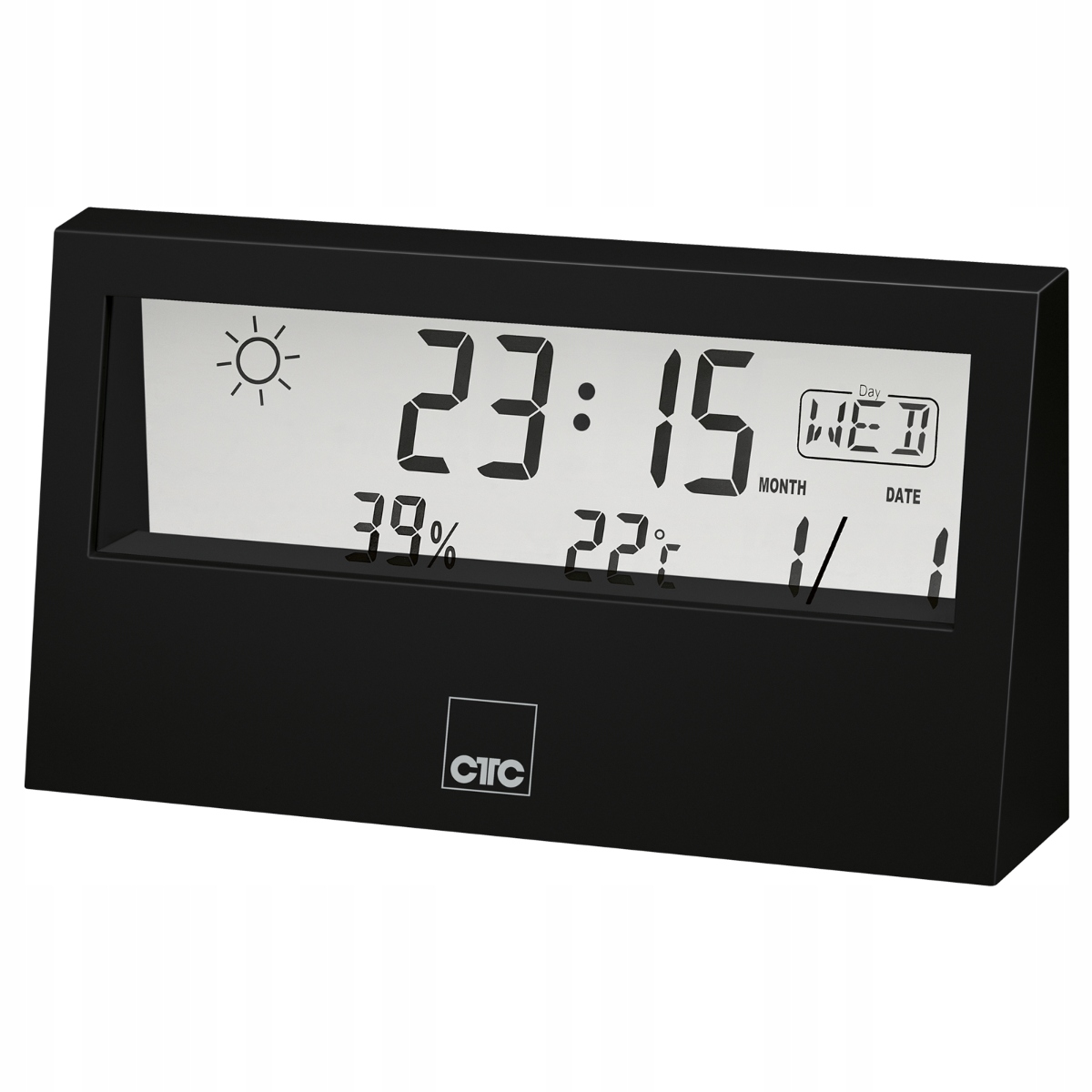 Простой в использовании метеорологической станции от Clatronic, которая отображает прогноз погоды, время суток, дата в день недели, месяц и год.