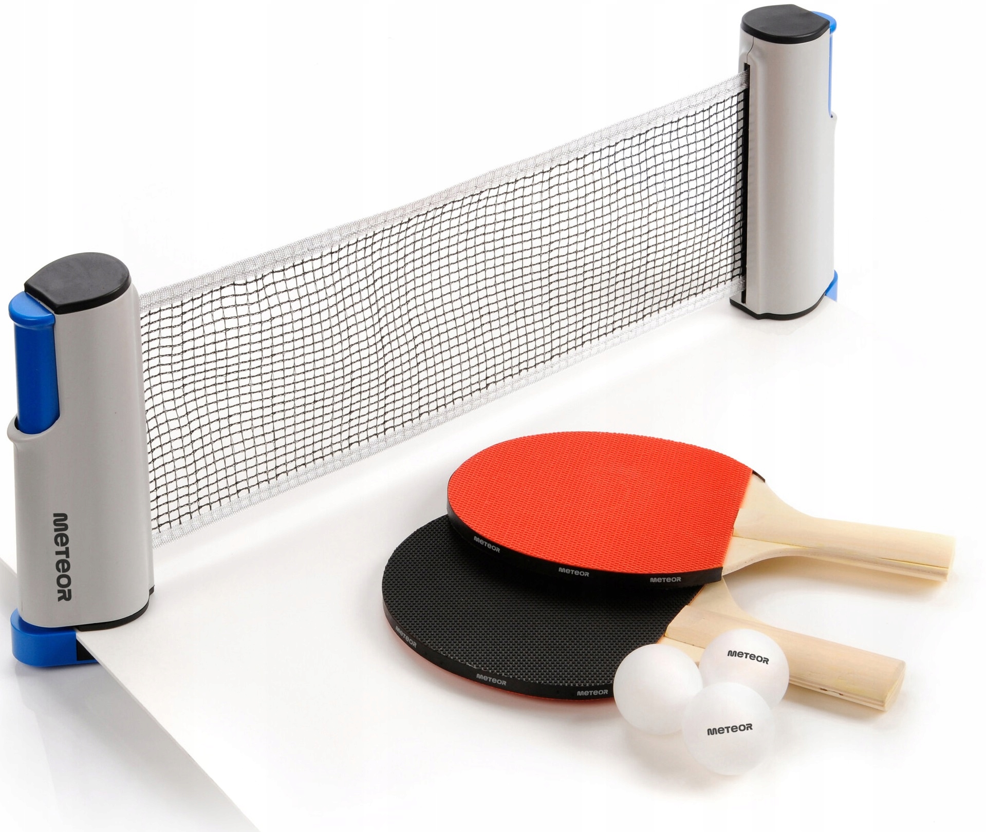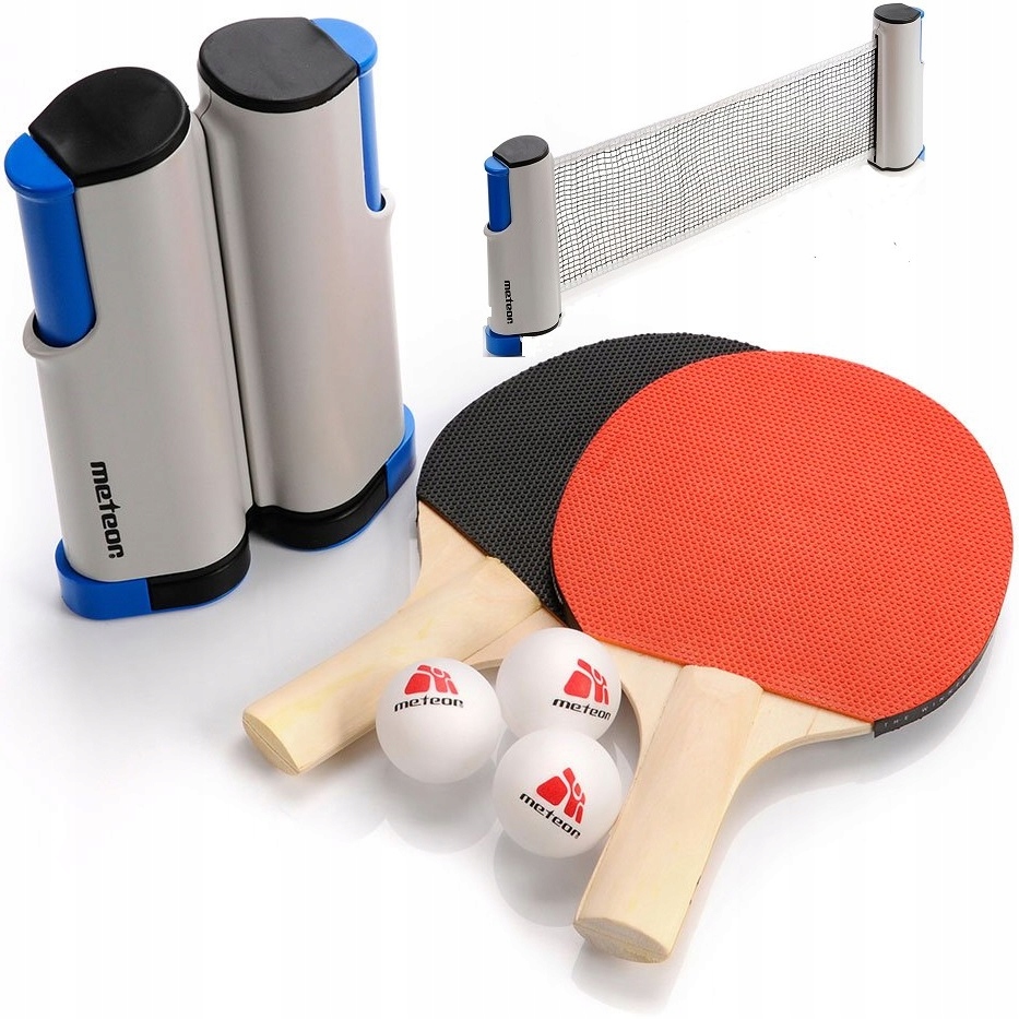 В комплект для настольного тенниса входит сетка, две ракетки и 3 мяча с логотипом Метеор.