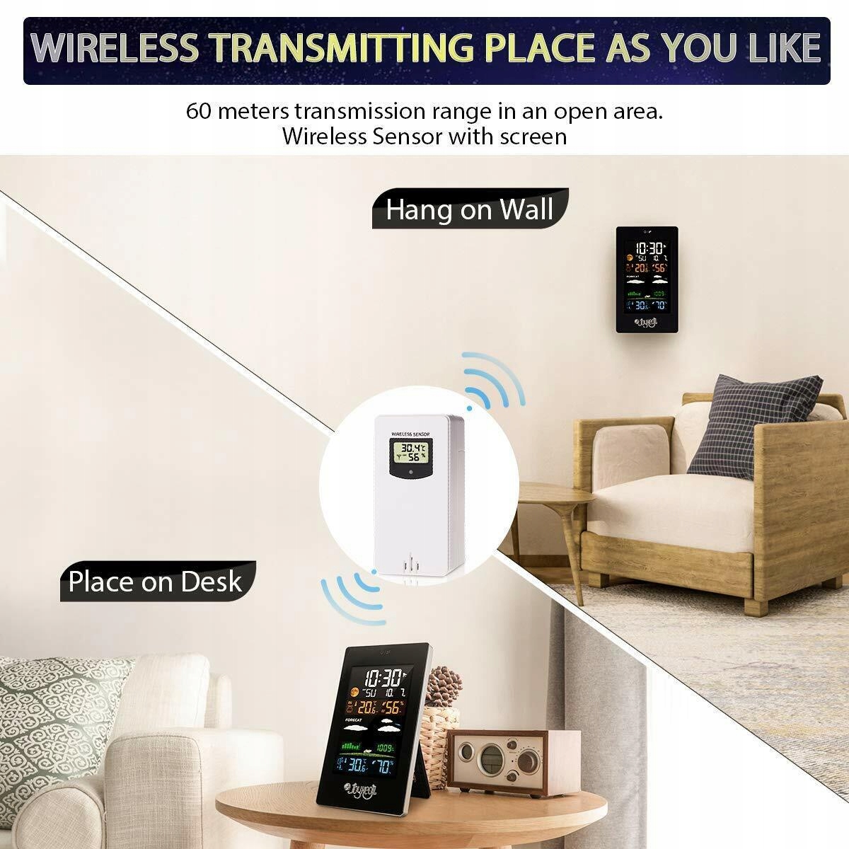- Настенное крепление или настольная подставка: модель метеостанции Joyxeon — новейшая модель 2020 года с цветным ЖК-дисплеем и беспроводным уличным датчиком. Благодаря отверстию сзади вы можете повесить часы JOYXEON с метеостанцией на стену. Его можно разместить на столе, сзади имеется выдвижная опора. Наружный датчик водонепроницаем и имеет степень защиты IPX44. Однако лучше повесить его на внешнюю стену с карнизом или использовать водонепроницаемые меры.