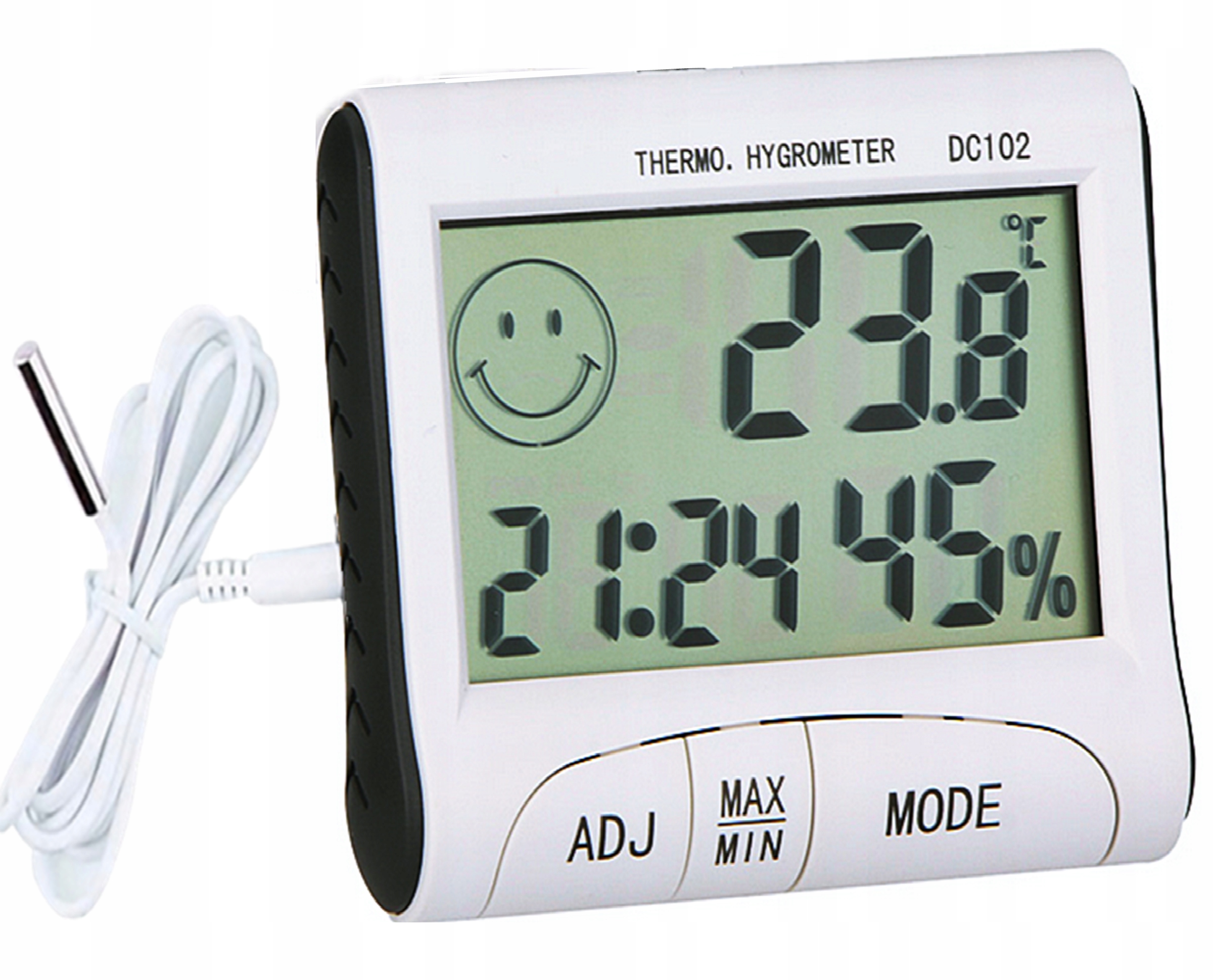 Большой и четкий ЖК-дисплей, которым оснащено устройство, отображает температуру по шкале Цельсия или Фаренгейта. b >устройство отображает самые низкие и самые высокие значения, зафиксированные в течение дня. Также на экране имеется графическая индикация в виде улыбающегося или грустного лица. Это улыбка. при температуре 18-25 градусов и относительной влажности 40-65%. Когда параметры выходят за эти пределы, на экране появляется грустное лицо.