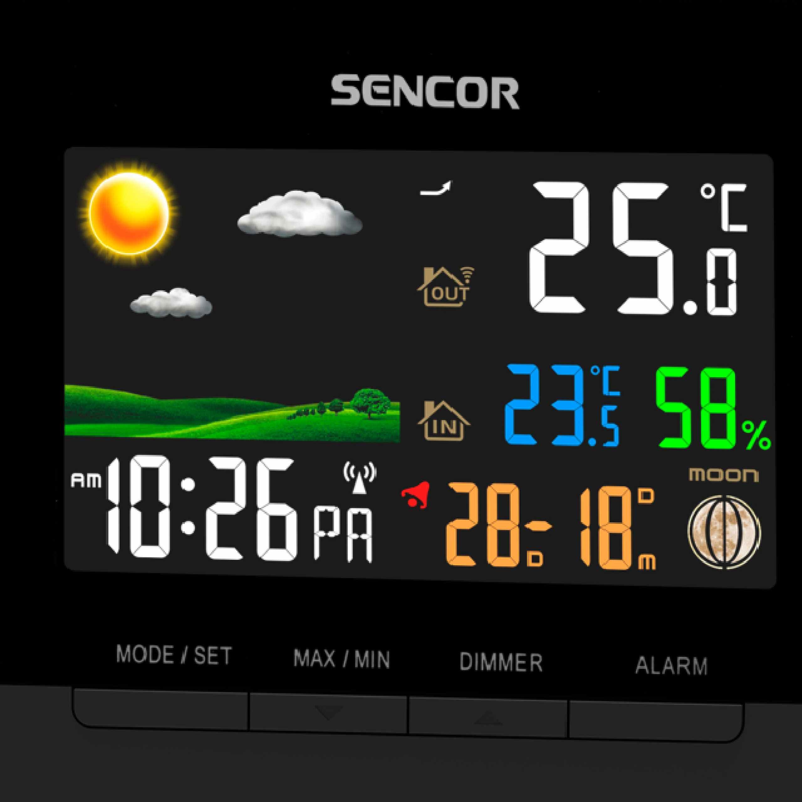 Дисплей метеостанции Sencor SWS 5400 имеет функцию затемнения и яркости на трех разных уровнях. Если вы хотите удобно пользоваться нашим устройством вечером, то правильная настройка яркости наверняка будет полезна. Большие значки и цифры на цветном дисплее также являются большим преимуществом.