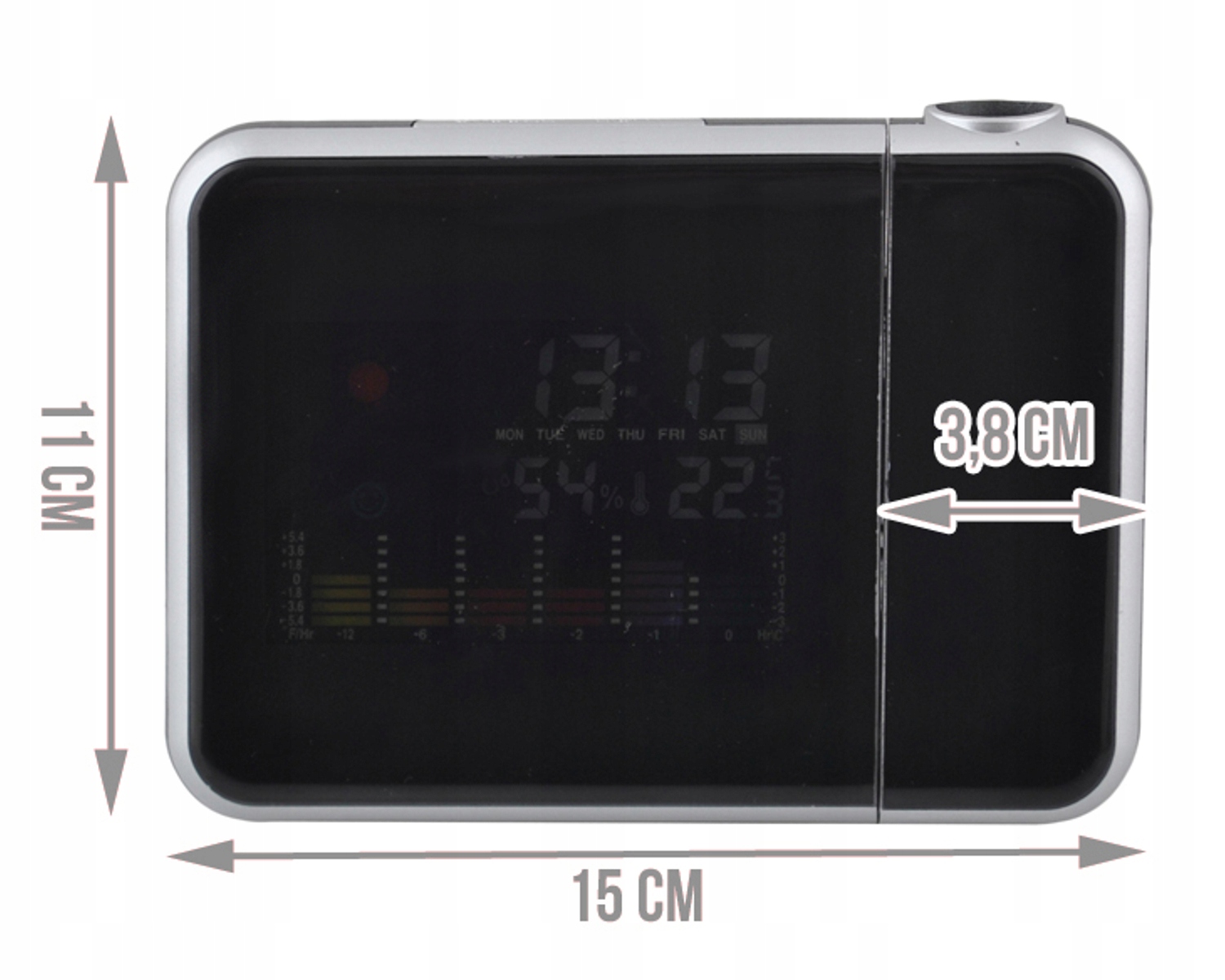 -Temperatature внутри ° C или ° F- Внутри влажности в погоде. Условия с помощью часов функции проекции на стене 24/12-ALARM COMCE с датой носовой даты и дня с улыбкой с улыбкой в неделю. В лицевой температуре в номере не являются оптимальные моды с 2 x AAA Batteries (не в сети 4.5V (не включенные в силу). и активный (отображается примерно 3 сек. после запуска с кнопки)