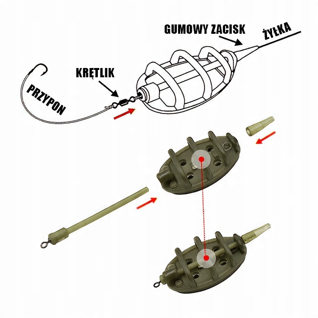 Выберите из набора подходящую кормушку Method Feeder с учетом условий ловли и размера рыбы, которую хотите поймать. Наденьте резиновый зажим на основную леску, затем проденьте основную леску через трубку, предотвращающую запутывание корзины для приманки. Привяжите вертлюжок к основной леске и вставьте его в трубку, препятствующую запутыванию.