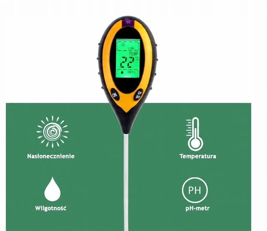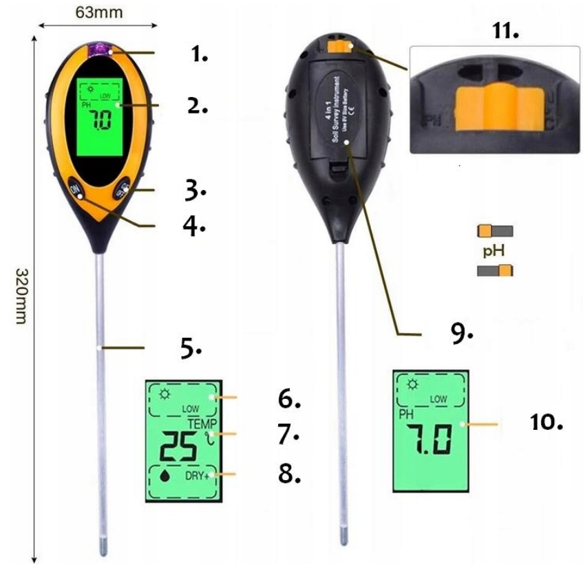 Электронный садовый тестер позволяет проверять кислотность (pH), солнечный свет, влажность и температуру почвы. Изменение режима работы между измерением pH и солнечного света, а также измерением температуры, влажности и солнечного света осуществляется с помощью переключателя, расположенного на задней панели устройства.