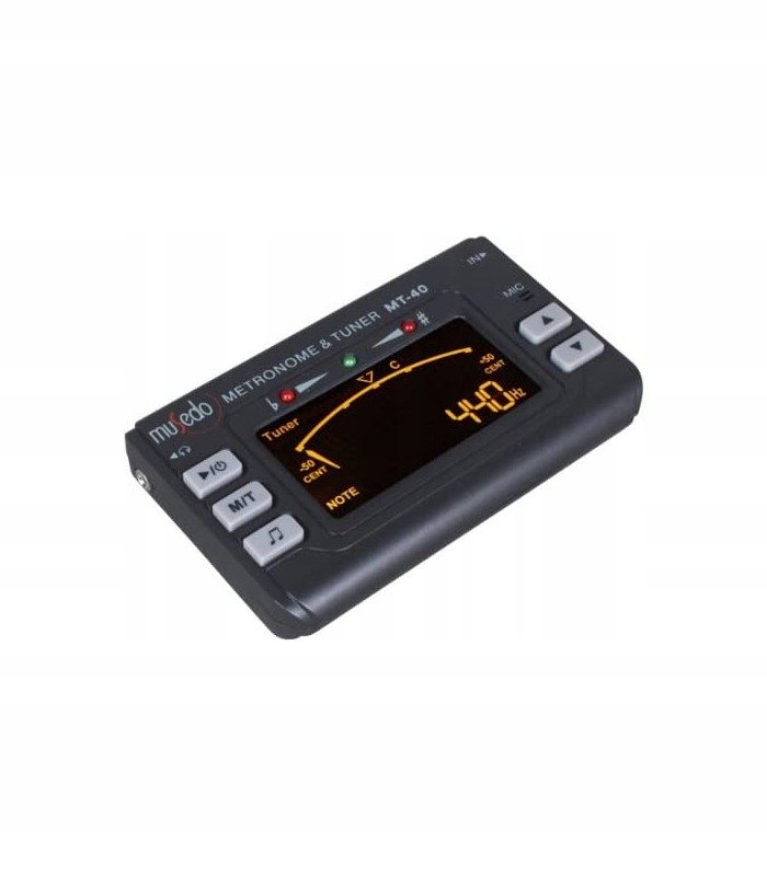 Метроном Musedo модель MT40 с дополнительными функциями тюнера и камертона. Устройство имеет четкий дисплей, 3 контрольных светодиода зеленого и красного цвета, вход для наушников на небольшом разъеме, большой вход для звукоснимателя, динамик и внутренний микрофон.