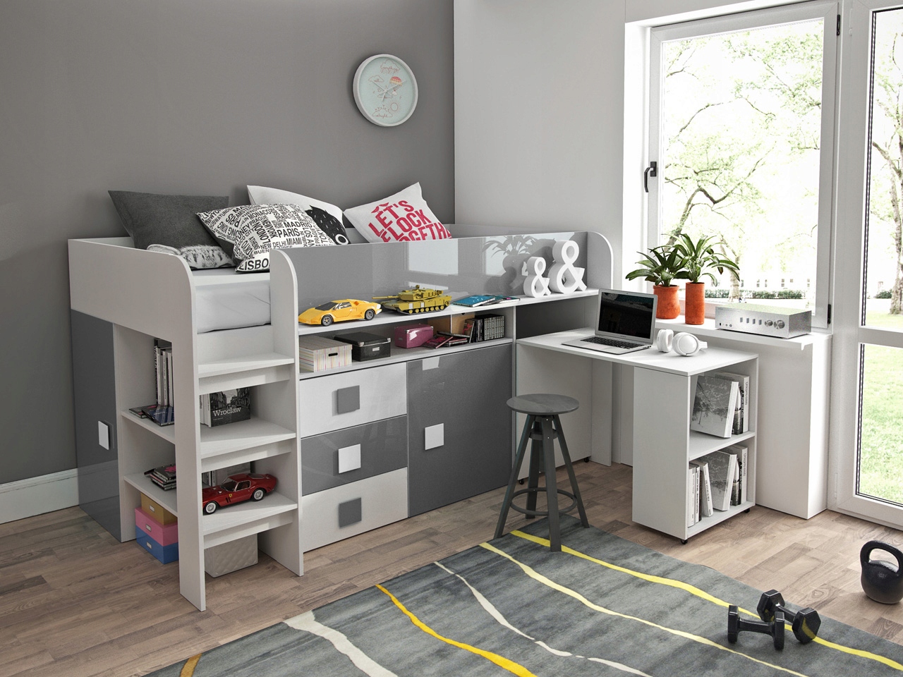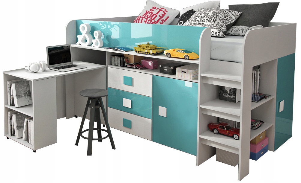 Кровать-антресоли с ящиками, выдвижным столом и шкафом с тромбоном- типа штанга для одежды. Современная конструкция из матового ламинированного ДСП и глянцевых фасадов, дополненная каркасом из перфорированной плиты, который также является конструктивным элементом всей конструкции.