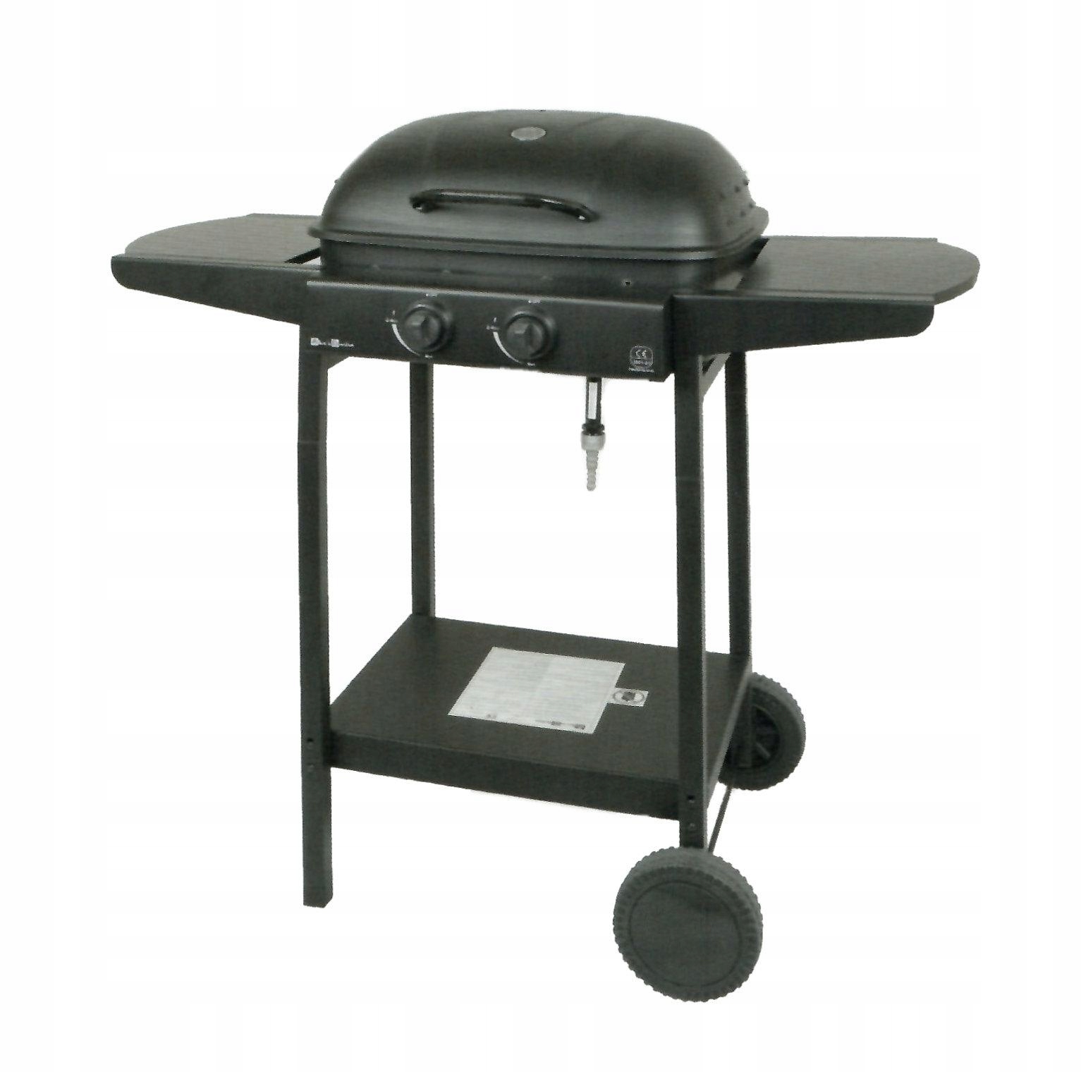 Газовый гриль с 2 конфорками, мощность 4 кВт, решетка из эмалированной стали, горелки из нержавеющей стали, металлические теплоотражатели над конфорками, пьезоэлектрический воспламенитель , 2 колеса, боковые полки, цвет: черный с серой передней панелью.