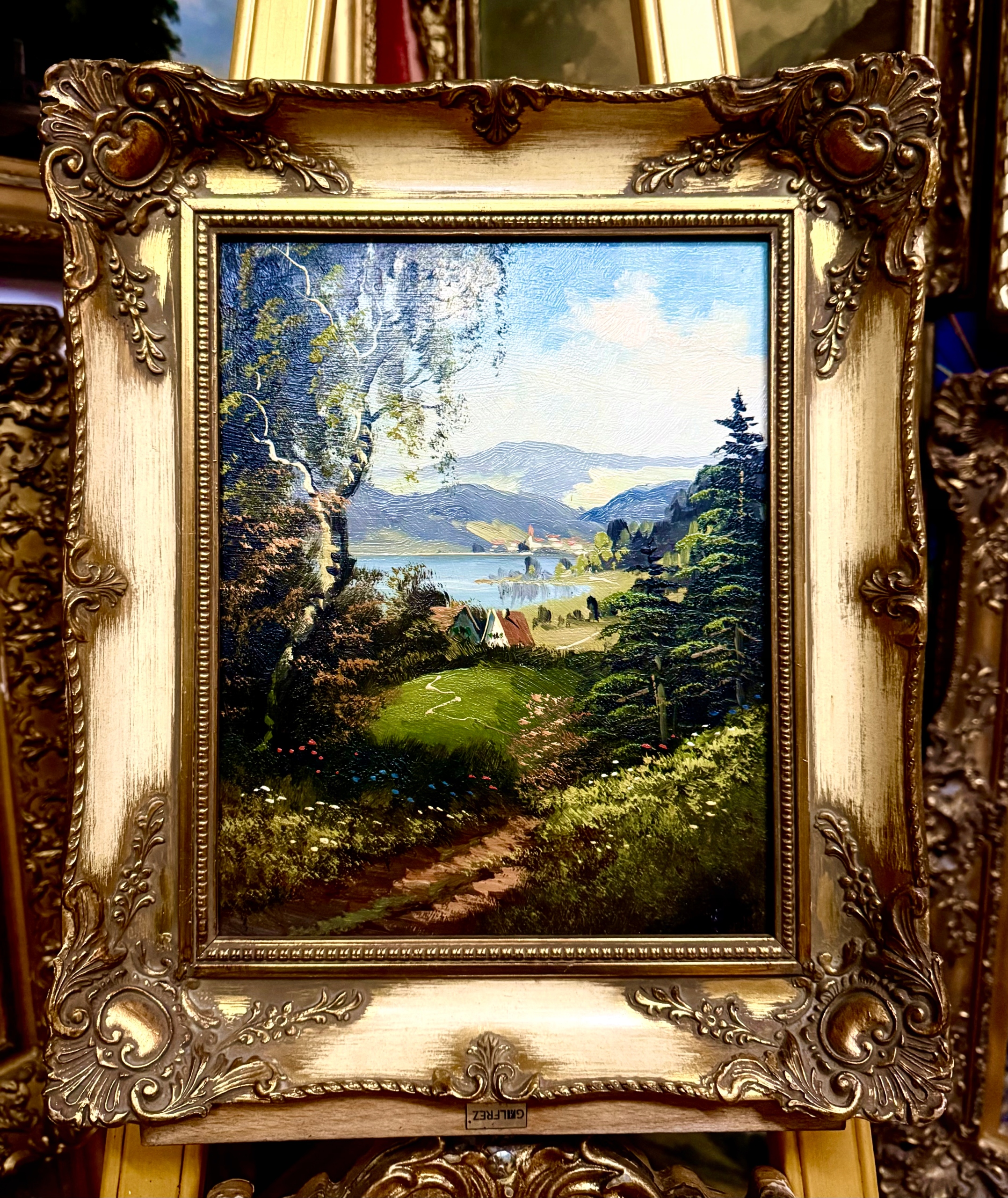 MIASTECZKO U PODNÓŻA GÓR PIĘKNY STARY OBRAZ W ZDOBIONEJ RAMIE Z NIEMIEC