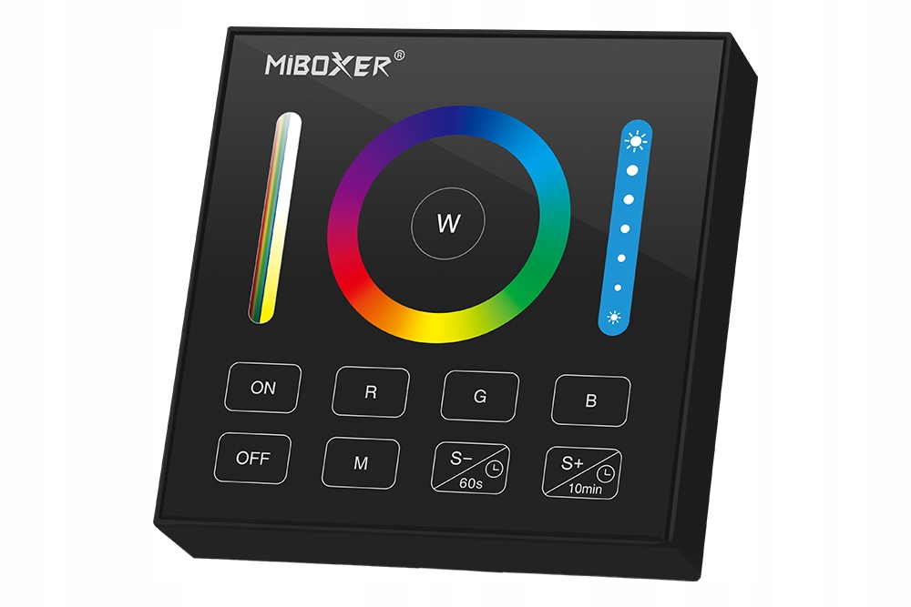 B0-B — настенная панель RGB + CCT для контроллеров Bergmen от MiBoxer с использованием технологии беспроводной радиопередачи 2,4G. Позволяет регулировать яркость, цветовую температуру и насыщенность — 16 миллионов цветов на выбор. Возможность настроить автоматическое выключение света через 60 секунд или 10 минут. Максимальная дистанция управления до 30 м. Питание от аккумулятора 3 В (2 шт. ААА). Установка не требует инструментов и дополнительной проводки.