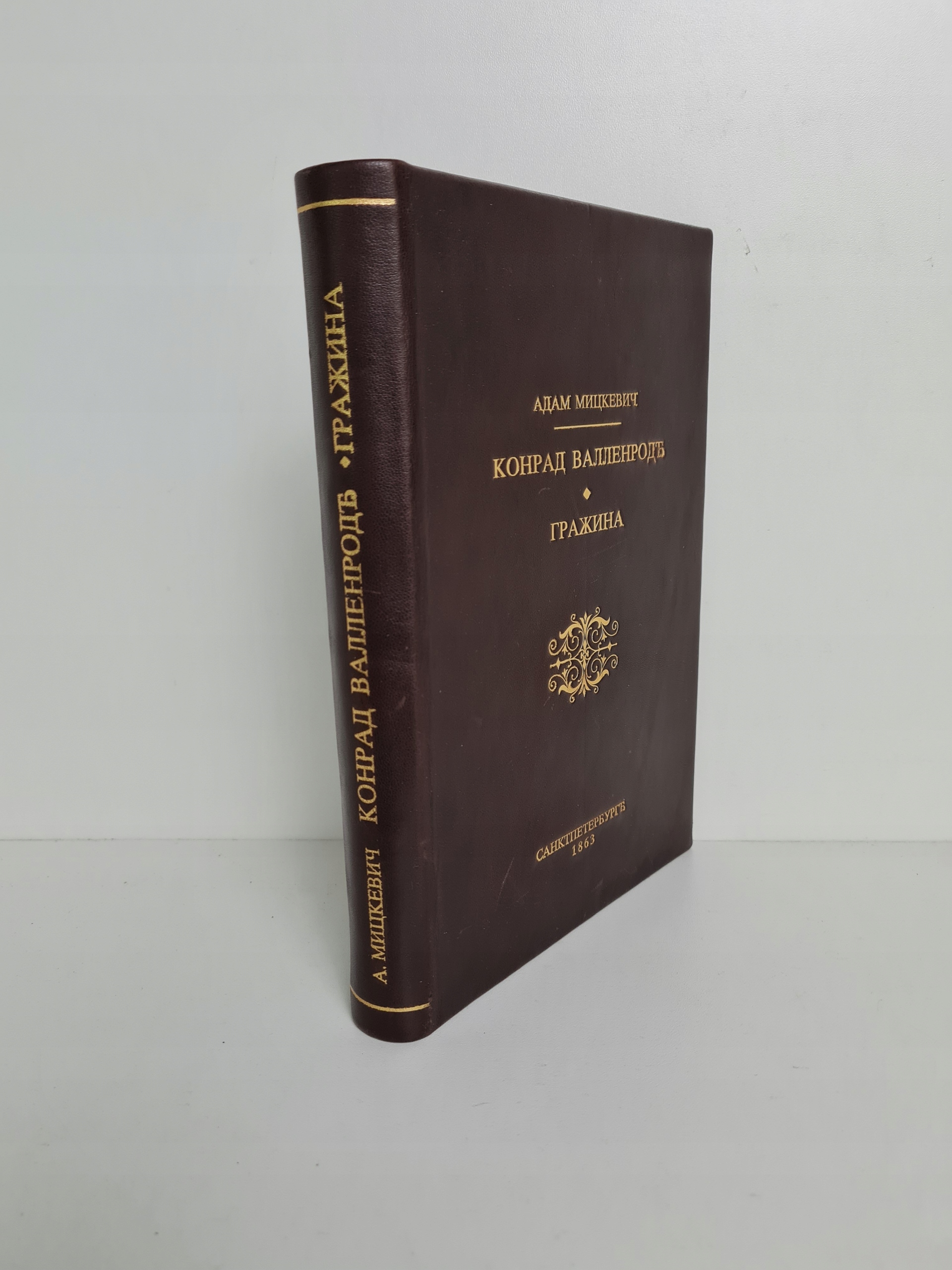 КОНРАД ВАЛЛЕНРОД ГРАЖИНА Стихи Адама Мицкевича. Перевод В. Бенедиктов. Рисунки Я. Тысевича. С. Петербург 1863. Издание Книгопропрезента и Типографа М.О. Вольфа, с. 191, портрет 1 (гравюра на дереве), табл. раскоп. 18 (гравюры на дереве), многочисленные иллюстрации. в тексте (гравюры на дереве), 23 см, изд. кор. кожа из синицы. на лице и позвоночнике.