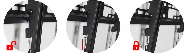 Специальный механизм безопасности автоматически блокирует крепление после установки на него телевизора. Чтобы разблокировать механизм, если вам нужно демонтировать телевизор с крепления, потяните за ниточки. Благодаря такому решению монтаж и демонтаж телевизора на креплении становится проще, безопаснее и очень устойчиво.