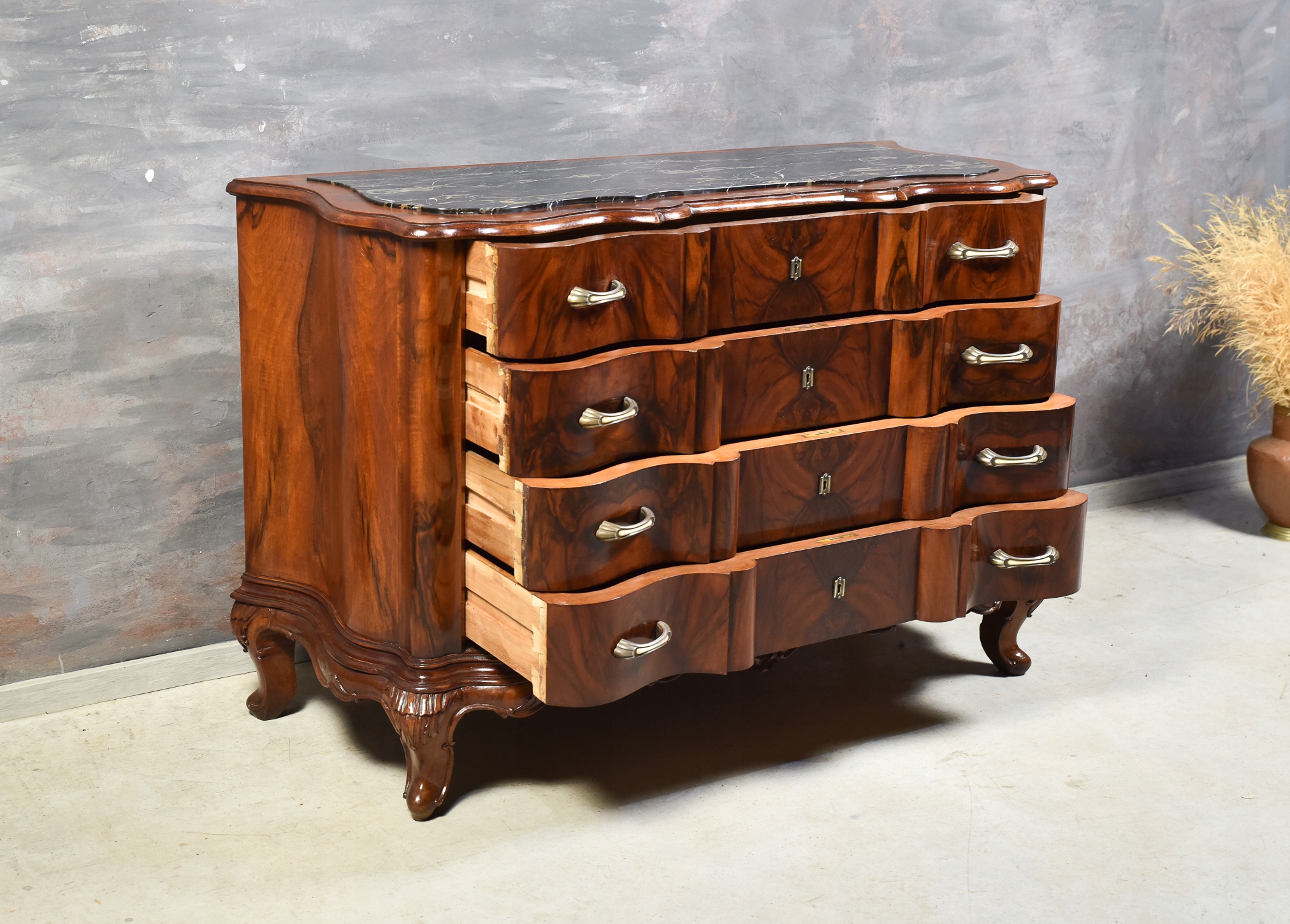 МАССИВНЫЙ КОМОД, С БОГАТОЙ РЕЗЬБОЙ, 4 ЯЩИКА, МАССИВ ОРЕХА, СТЕКШИНА ИЗ МРАМОРА