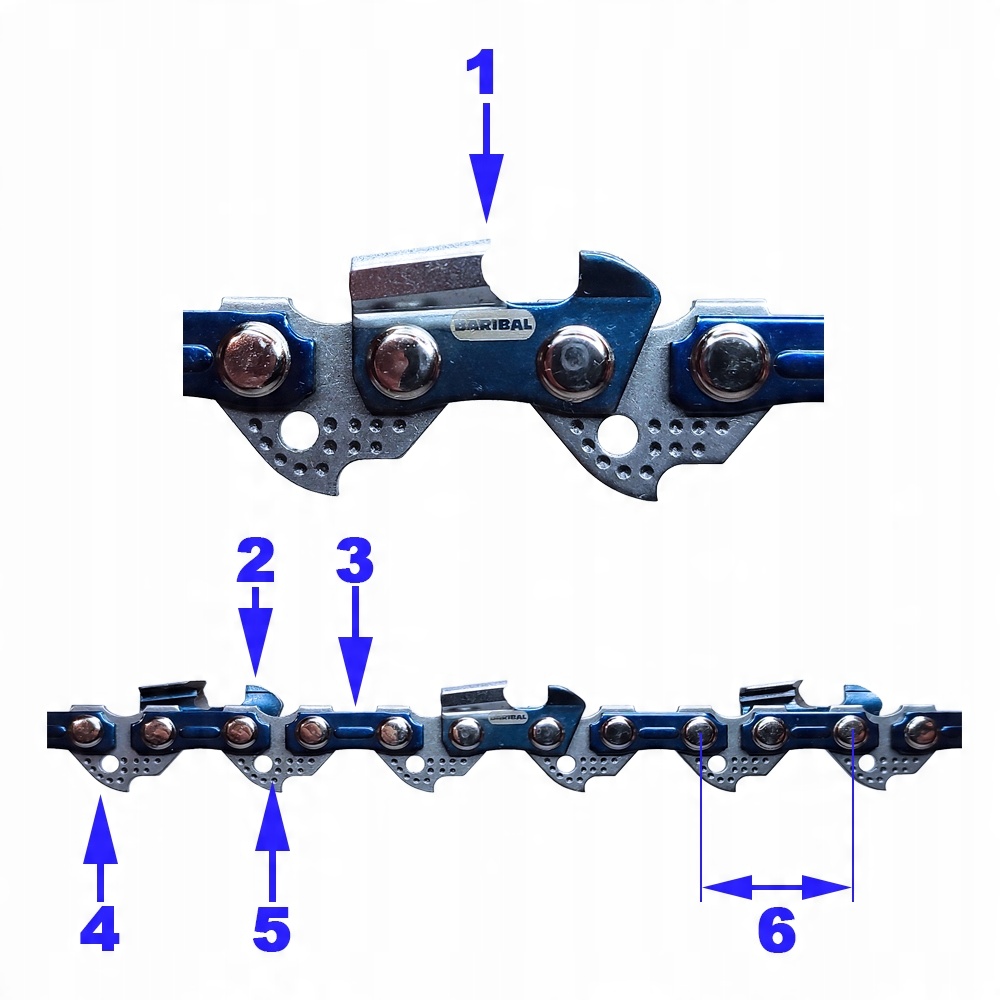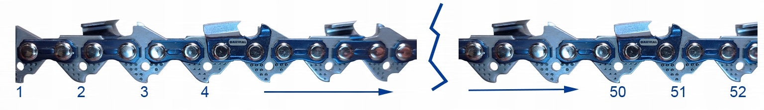 Количество направляющих звеньев — легко определить путем подсчета звеньев цепи, перемещающихся в направляющей канавке. Их количество зависит от длины используемой направляющей шины и, за исключением цепей с нечетным числом направляющих звеньев, их в два раза больше, чем режущих зубьев цепи.
