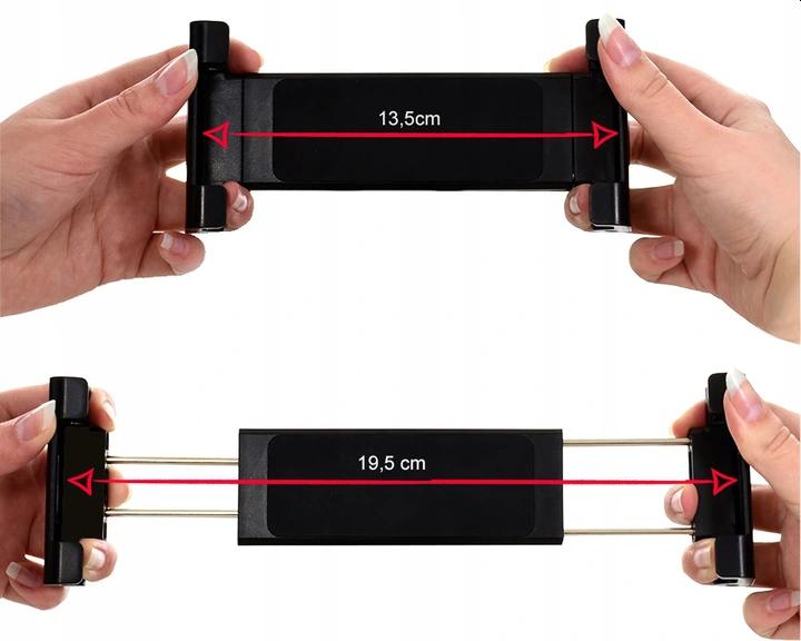Зажимы держателя имеют чрезвычайно широкий размах, на них можно разместить планшет шириной от 13,5 см до 19,5 см, а также он хорошо подойдет для больших телефонов. Минимальная высота телефона — 13,5 см!