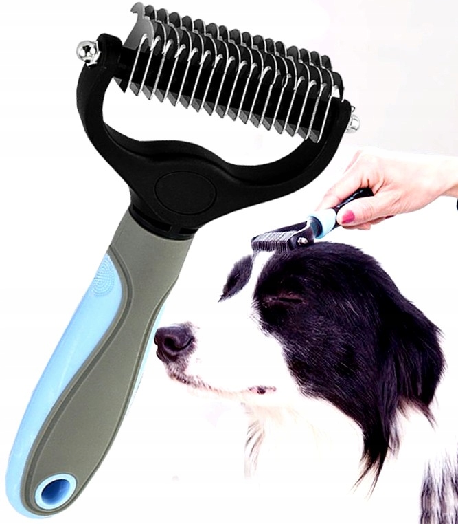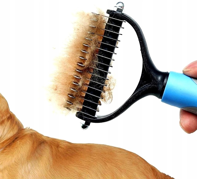 ✔️ Расческа имеет двусторонние изогнутые лезвия, которые безопасно удаляют подшерсток собаки, колтуны и запутанную шерсть.