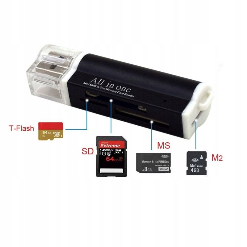 - Устройство работает с картами MicroSD / MicroSDHC / MicroSDXC / SD / SDHC / SDXC / MMC / ProDuo / Duo / M2.