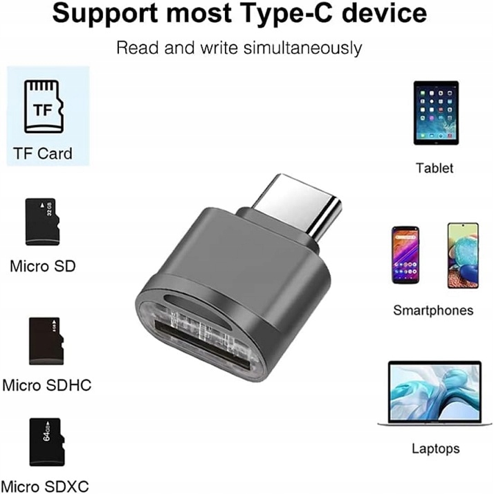 Это устройство чтения карт Micro SD работает с такими устройствами, как ноутбуки, смартфоны и планшеты с портами USB-C. Работает только с картами памяти TF/MicroSD. Совместимо с картами памяти TF / Micro SD / Micro SDHC / Micro SDXC.