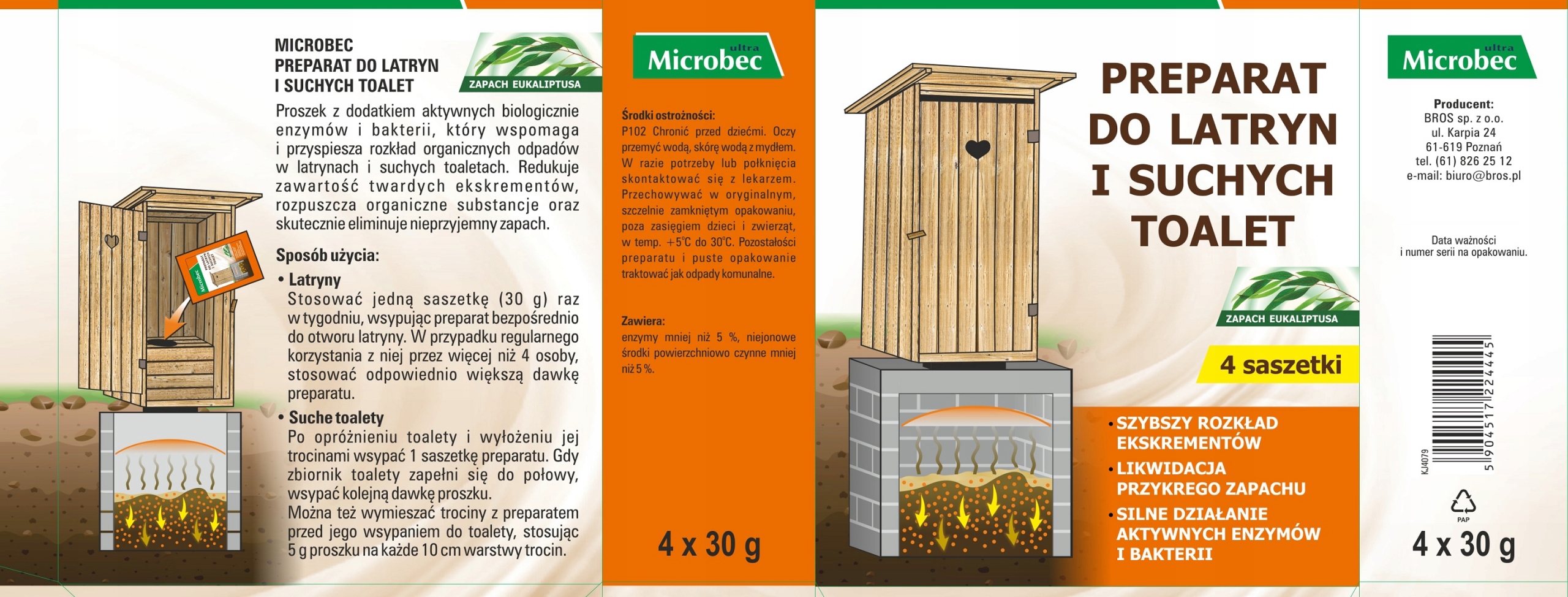 BROS - Препарат Microbec ultra для уборных и сухих туалетов - 4 пакетика по 30 грамм - эвкалипт