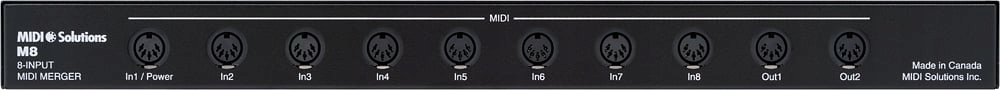 Комбайнер MIDI MIDI Solutions под названием M8 из серии MultiVoltage объединяет и суммирует все MIDI-сообщения, появляющиеся на восьми MIDI-входах, и отправляет их. этот суммированный поток MIDI-данных поступает на оба его MIDI-выхода. Все типы MIDI-сообщений суммируются, включая сообщения System Exclusive, MIDI Clock и MIDI Time Code. Алгоритм быстрого суммирования гарантирует, что все MIDI-данные обрабатываются очень точно с минимально возможной задержкой.
