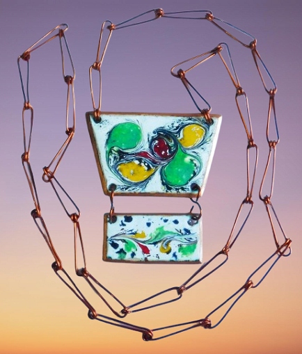 Аукционный пункт представляет собой подвеска/подвеска, видимая на фотографии. Он был привезен из Германии - купленного на Trodelhalle с украшениями. Он был сделан из меди - украшен красочной эмалью. Несомненно, это ручная работа. Подвеска не имеет крепежного изделия - он создает полную схему. Государство, как на фото.