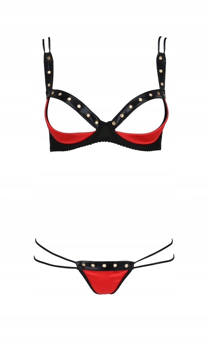 Комплект от PASSION из эластичного атласа и тюля. Открытый бюстгальтер и стринги, украшенные люверсами, придают всему образу оригинальный и очень сексуальный характер. Создан для женщин, осознающих свои чудесные достоинства и тело.