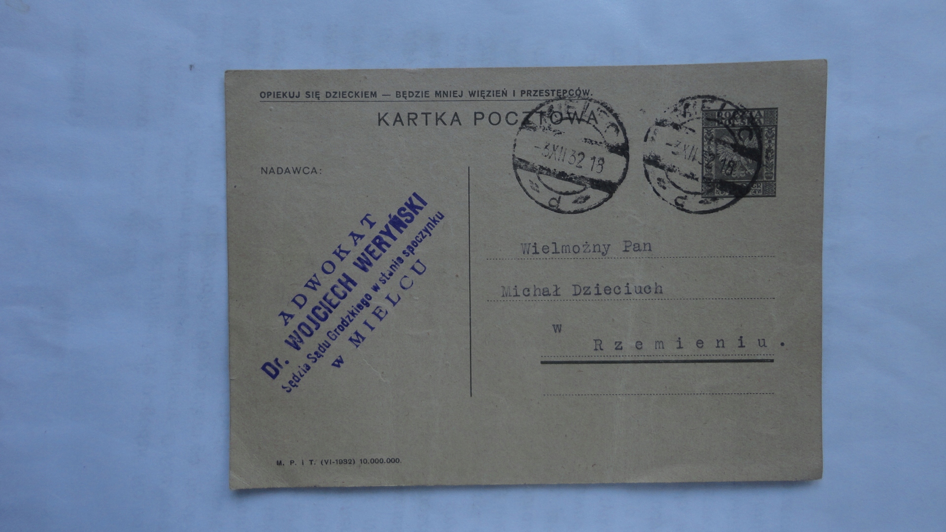 MIELEC ADWOKAT WERYNSKI KARTA KORESPONDENCYJNA 1932 ROK