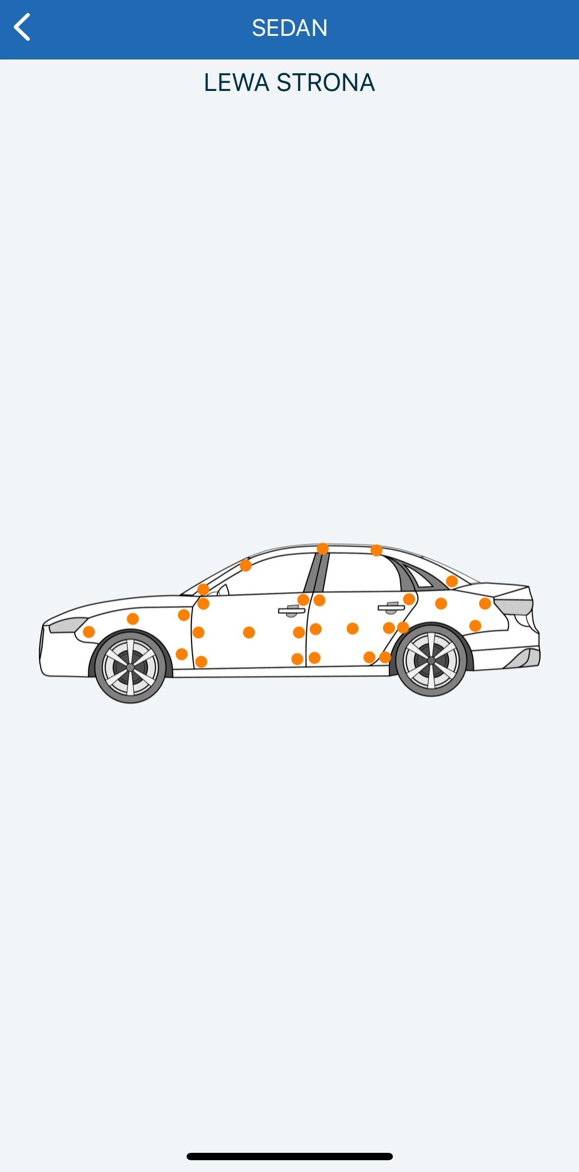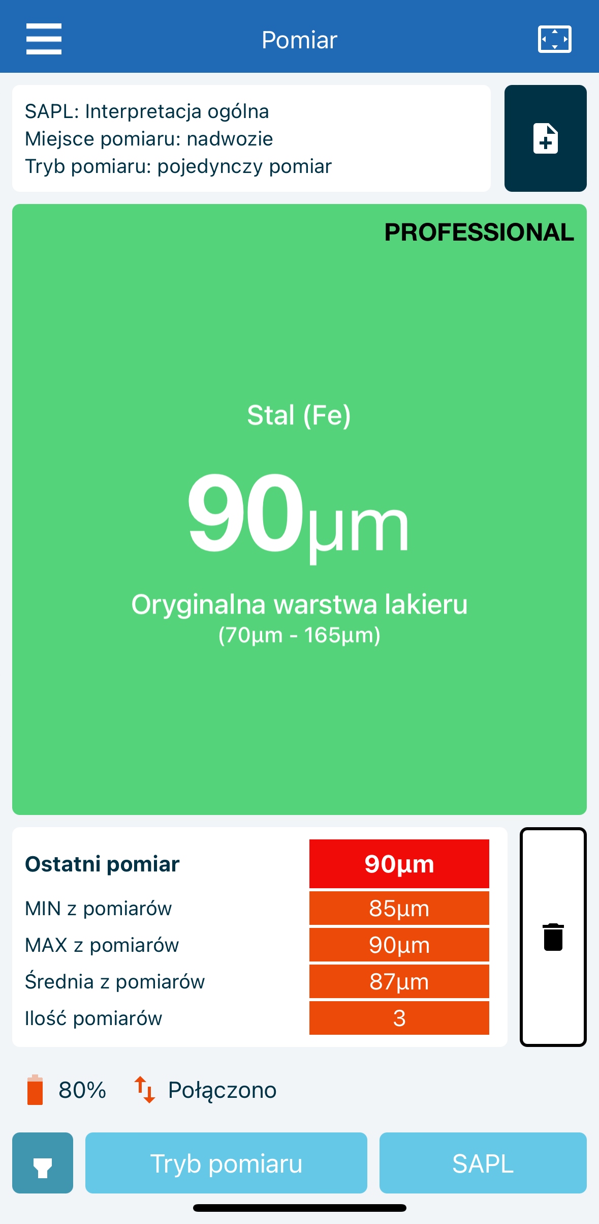 При измерении определенного элемента транспортного средства отображается цвет, обозначающий состояние толщины краски, который графически представляет толщину краски проверяемого элемента.