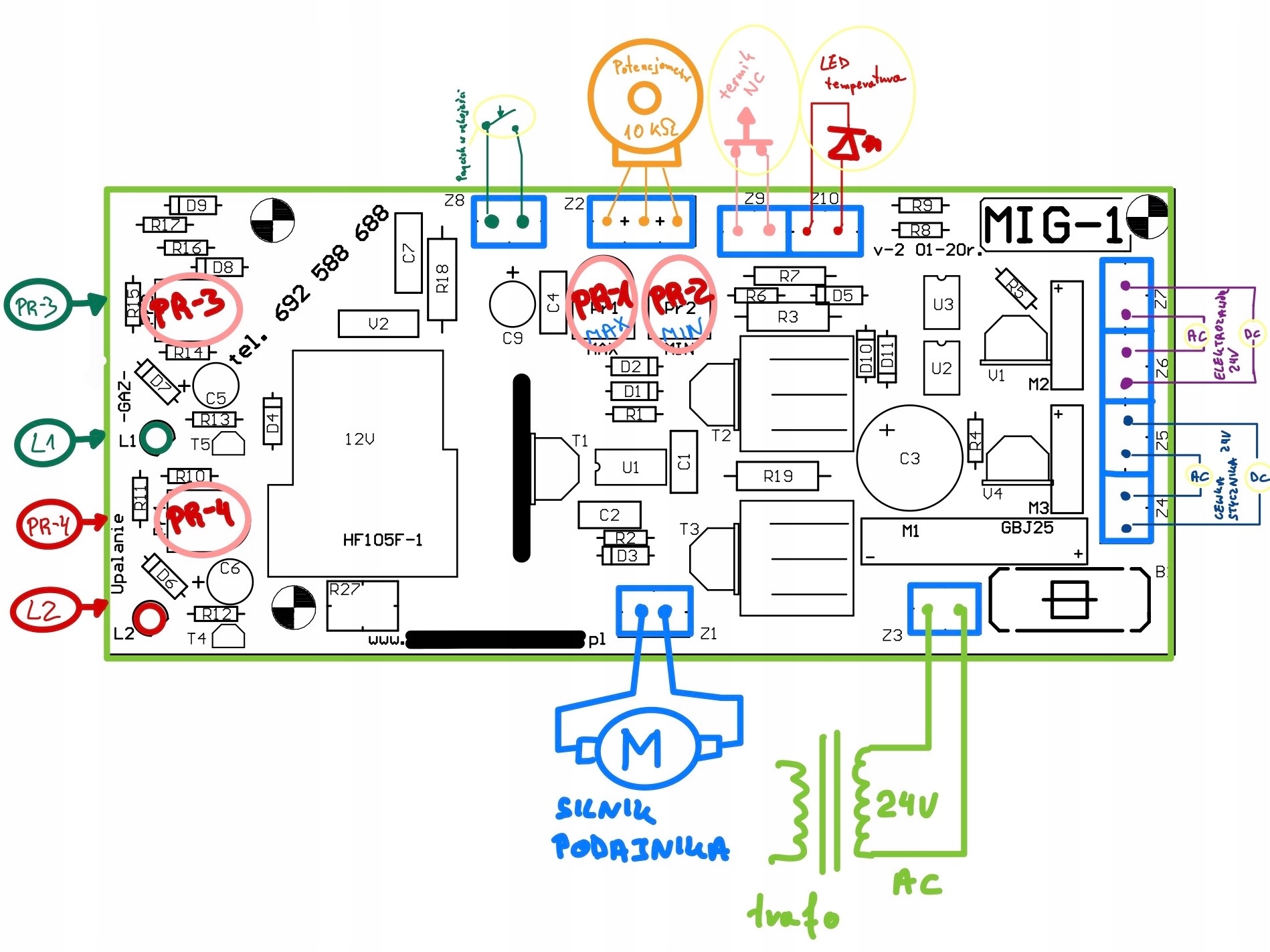 В комплект входит плата МИГ-1 и потенциометр регулировки скорости подачи проволоки, защитная термозащита от перегрузки и светодиод, сигнализирующий о перегреве.