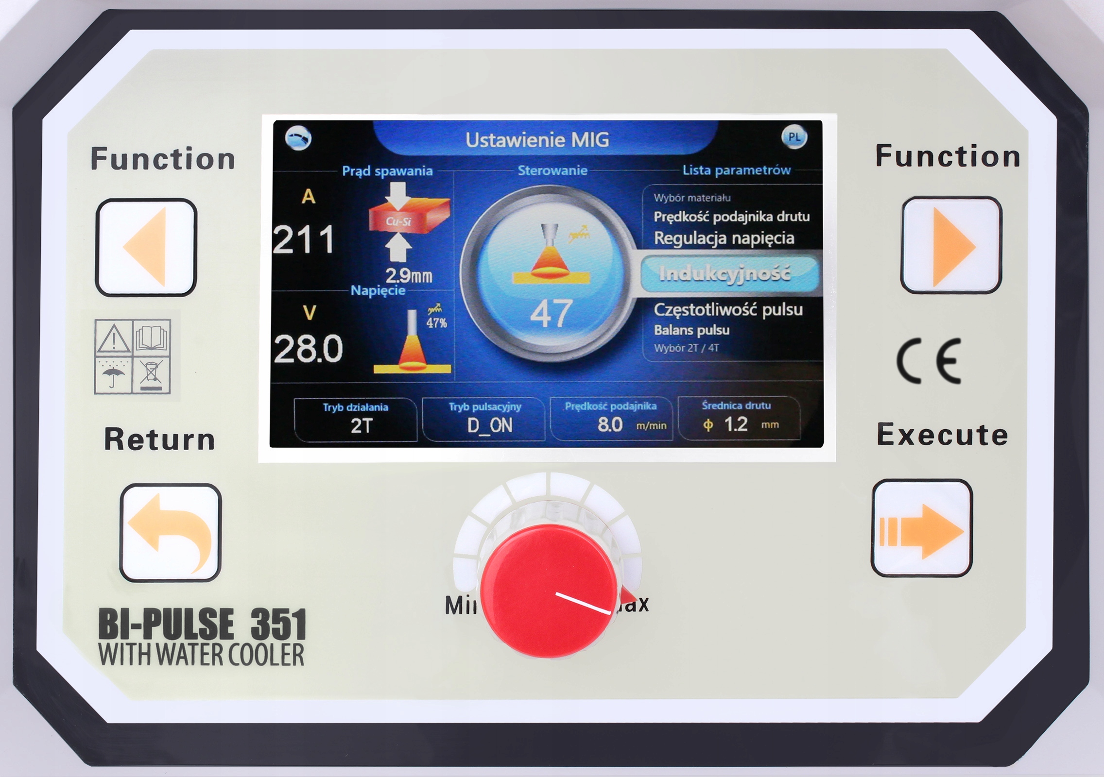 Интуитивно понятная и простая в использовании панель управления с цветным дисплеем позволяет быстро настроить все наиболее важные параметры сварки. Пользователь может выбрать один из пяти языков меню, включая польский. Благодаря синергетическим настройкам можно автоматически подбирать параметры сварки в зависимости от диаметра сварочной проволоки, а также толщины и типа материала. Аппарат имеет плавную регулировку напряжения и сварочного тока, оснащен системой защиты от тепловой перегрузки, предохраняющей от чрезмерного нагрева интегральных схем. Полуавтомат может сохранять 18 пользовательских программ и зажигать дугу: