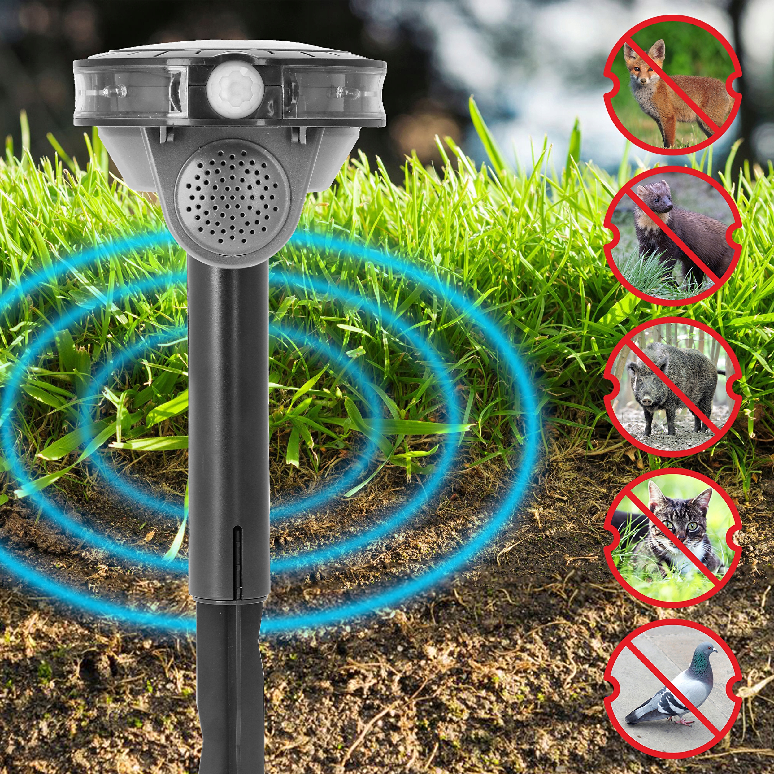 Отпугиватель — современное устройство, используемое для эффективного, гуманного и бесконтактного отпугивания животных (в том числе мышей, куниц, крыс). Он излучает сигналы на расстоянии 5-8 м, в радиусе 110-120 градусов. Место его установки не должно быть ограничено препятствиями, например, фундаментом, стеной, стеной.