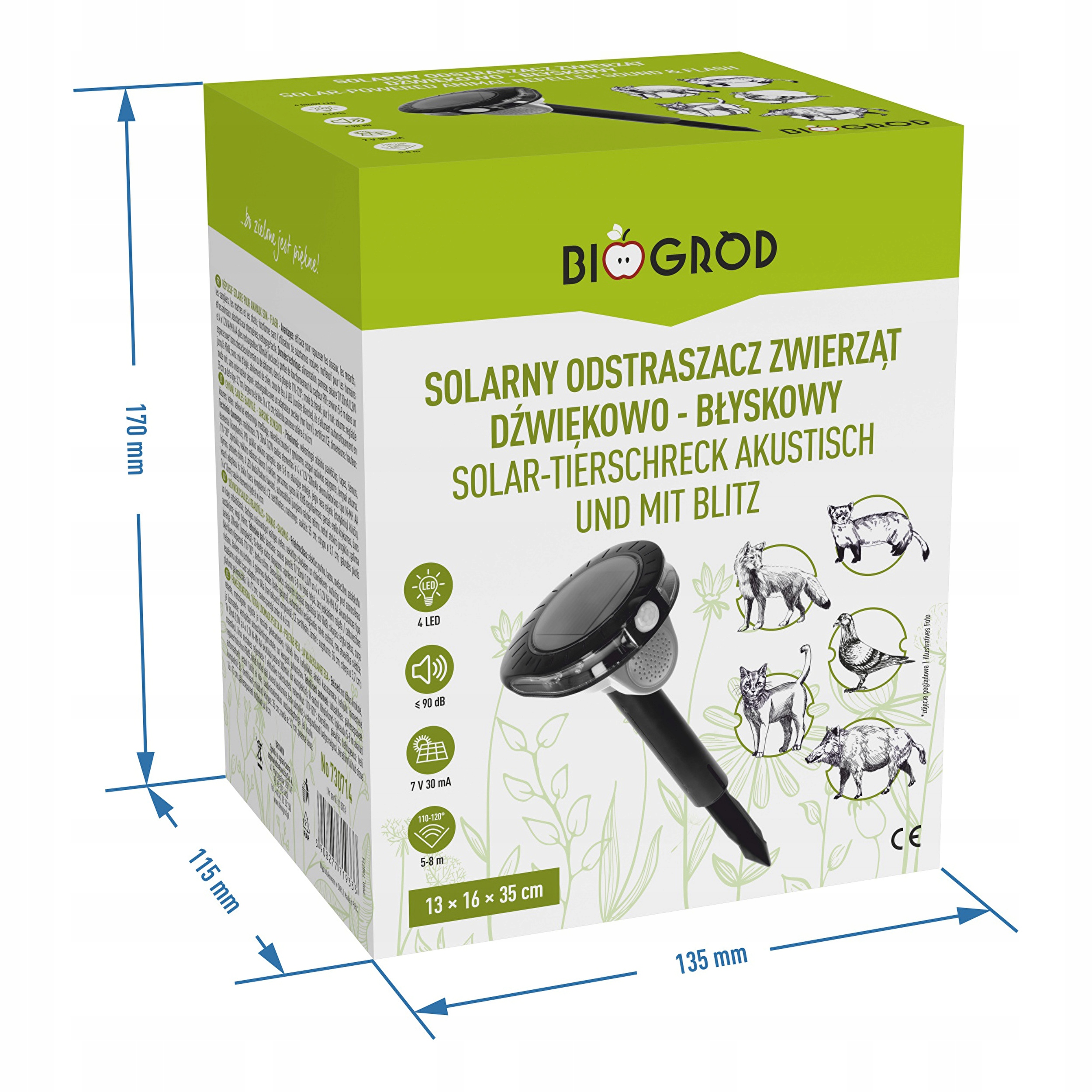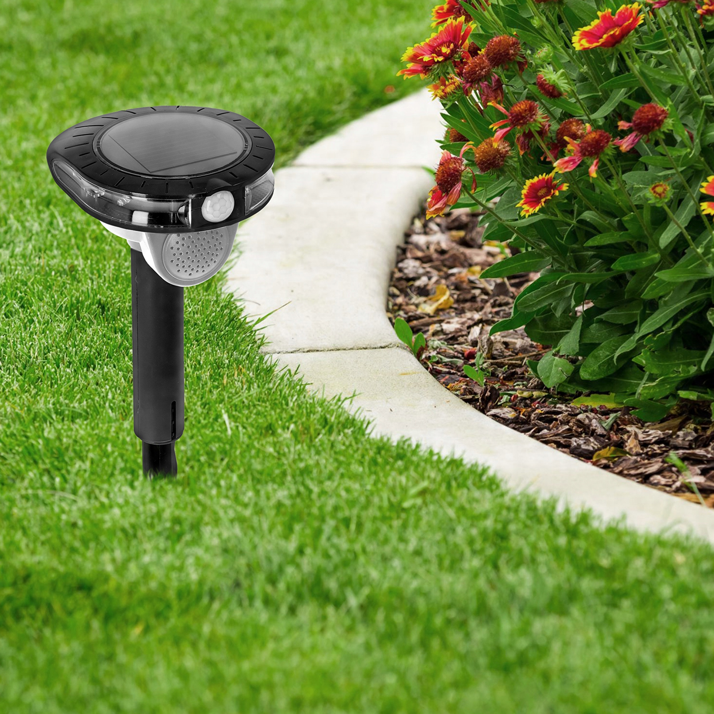 Солнечный отпугиватель животных (в том числе мышей, куниц, крыс) со звуком и вспышкой позволит вам эффективно избавиться от непрошеных гостей из вашего сада. Отпугиватель излучает сигналы на расстоянии 5-8 м, в радиусе 110-120 градусов.
