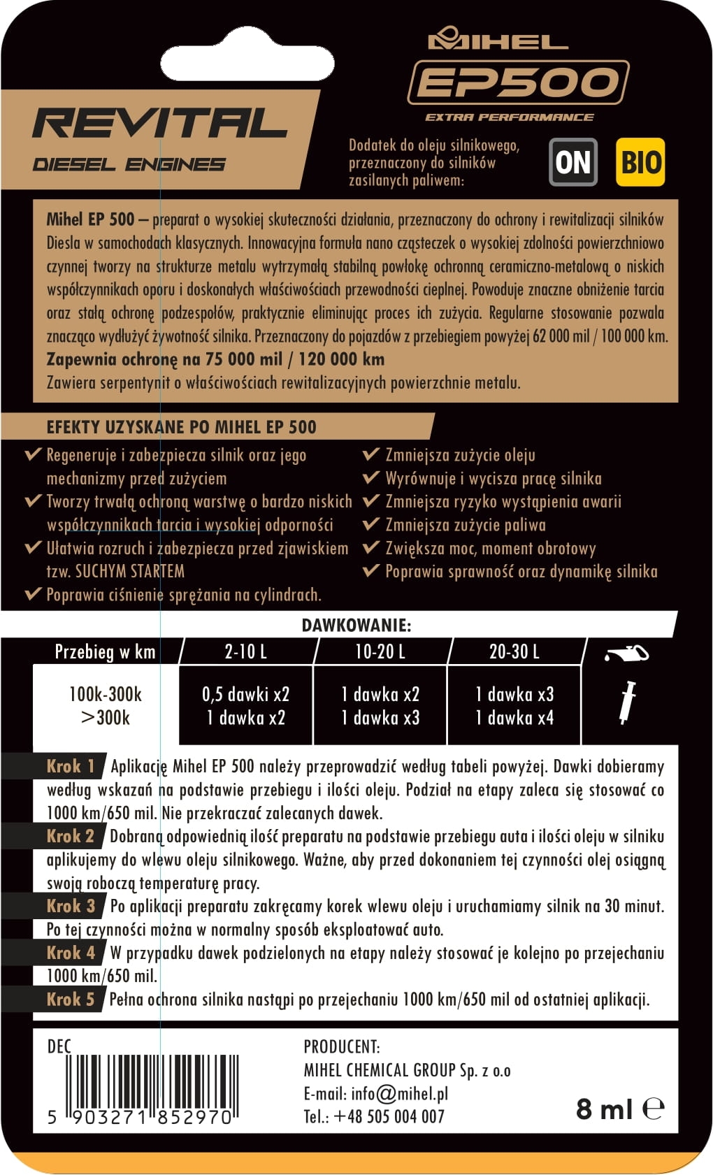 Производитель гарантирует эффективность и долговечность до до 120 000 км пробега. По истечении этого периода MIHEL EP500 DEC следует использовать снова.