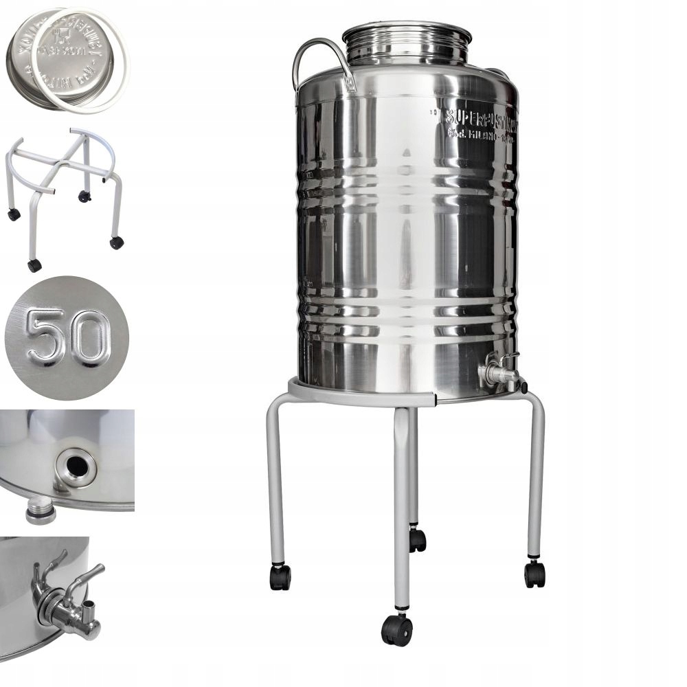 Бочка с высоким качеством изготовлена из постоянной нержавеющей стали и будет держать внутри 50 литров жидкости или свободных пищевых продуктов.