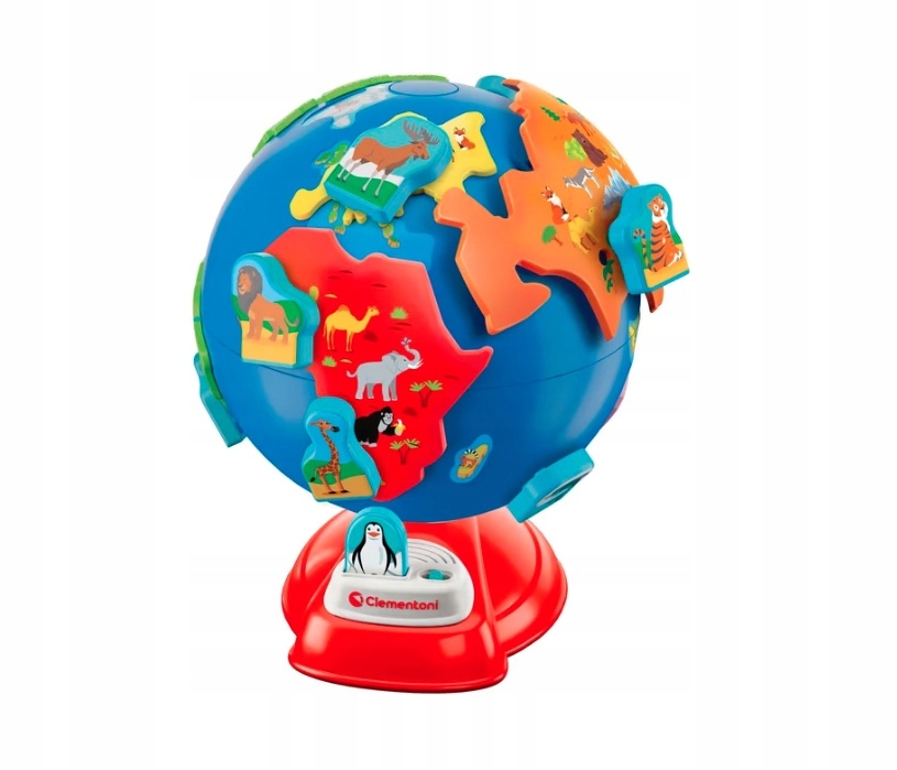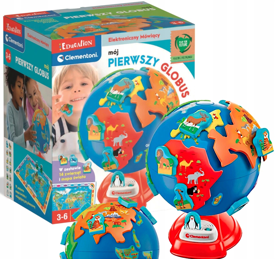 Большой электронный глобус из переработанного пластика с континентами и животными, которые можно комбинировать освоить первые концепции географии.
