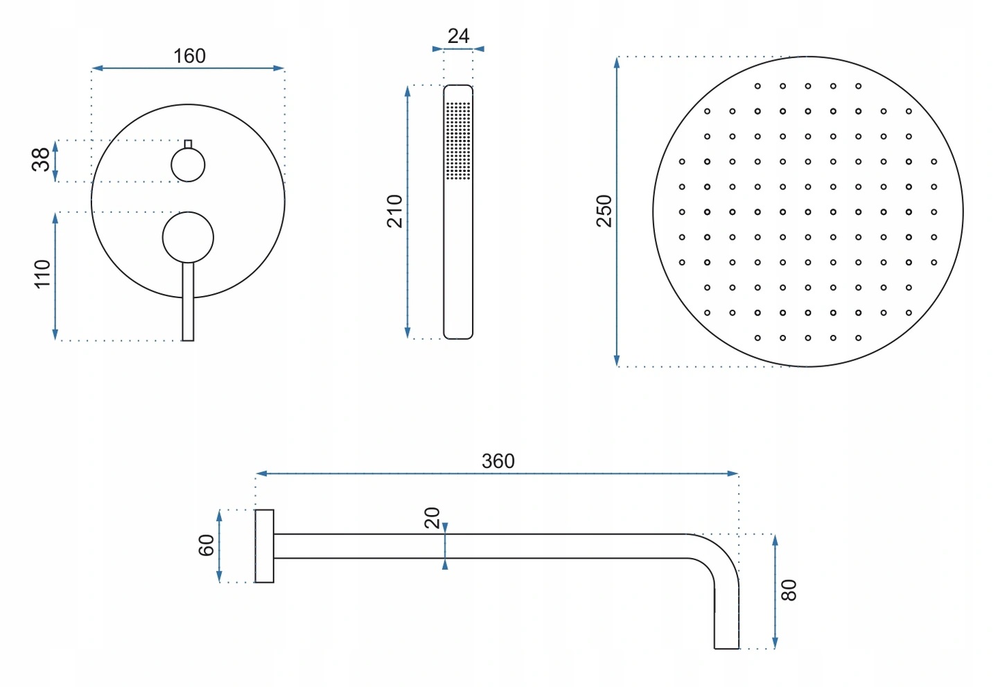 Все дополняется душевой головкой. Он адаптирован ко всему набору. Набор также включает в себя шланг для душа длиной 1,5 м.
