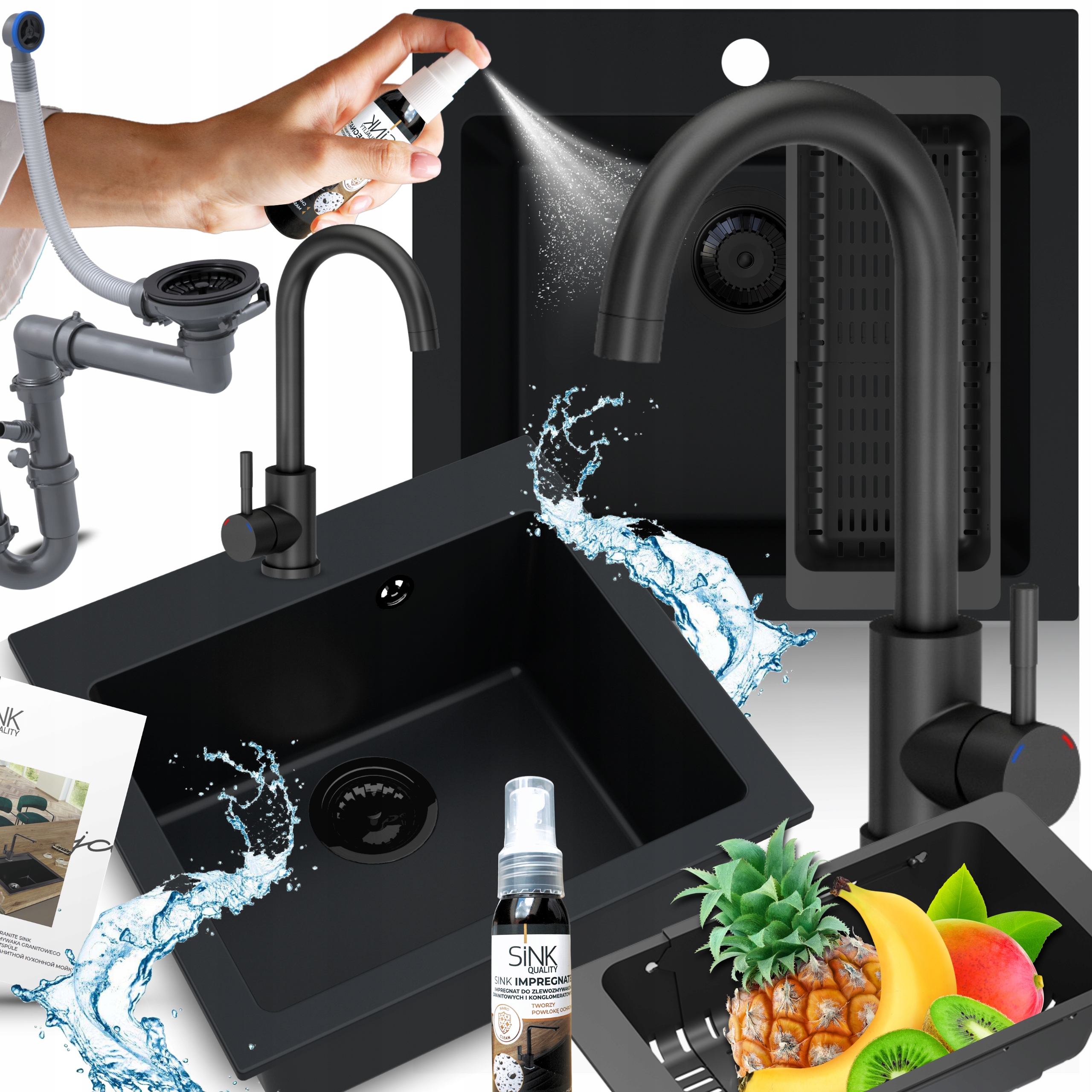 МИЙКА ГРАНІТНА ЧОРНА З КУХОННИМ ЗМІШУВАЧЕМ + РЕГУЛЬОВАНА ОБТІЧКА